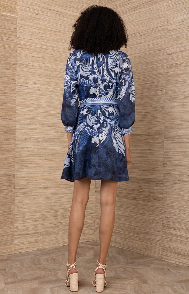 Escape to island vibes in this charming Belize Short Dress from Hale Bob. Featuring a smocked collar and front bodice buttons for a touch of texture, the 3/4 sleeves finish with smocked cuffs for extra flair. A tie belt cinches the waist while the swingy skirt swings freely with hidden hip pockets—perfect for stashing your essentials. An invisible back zip keeps things sleek and seamless. Navy perfection for effortless style.