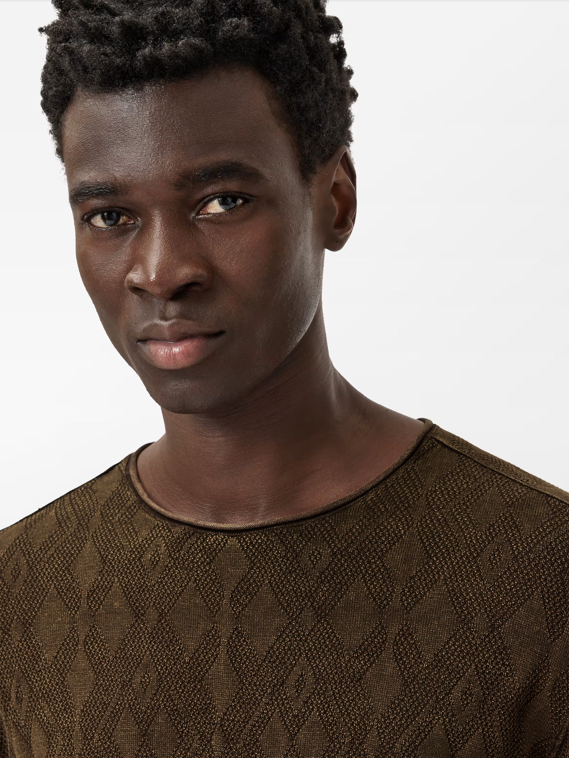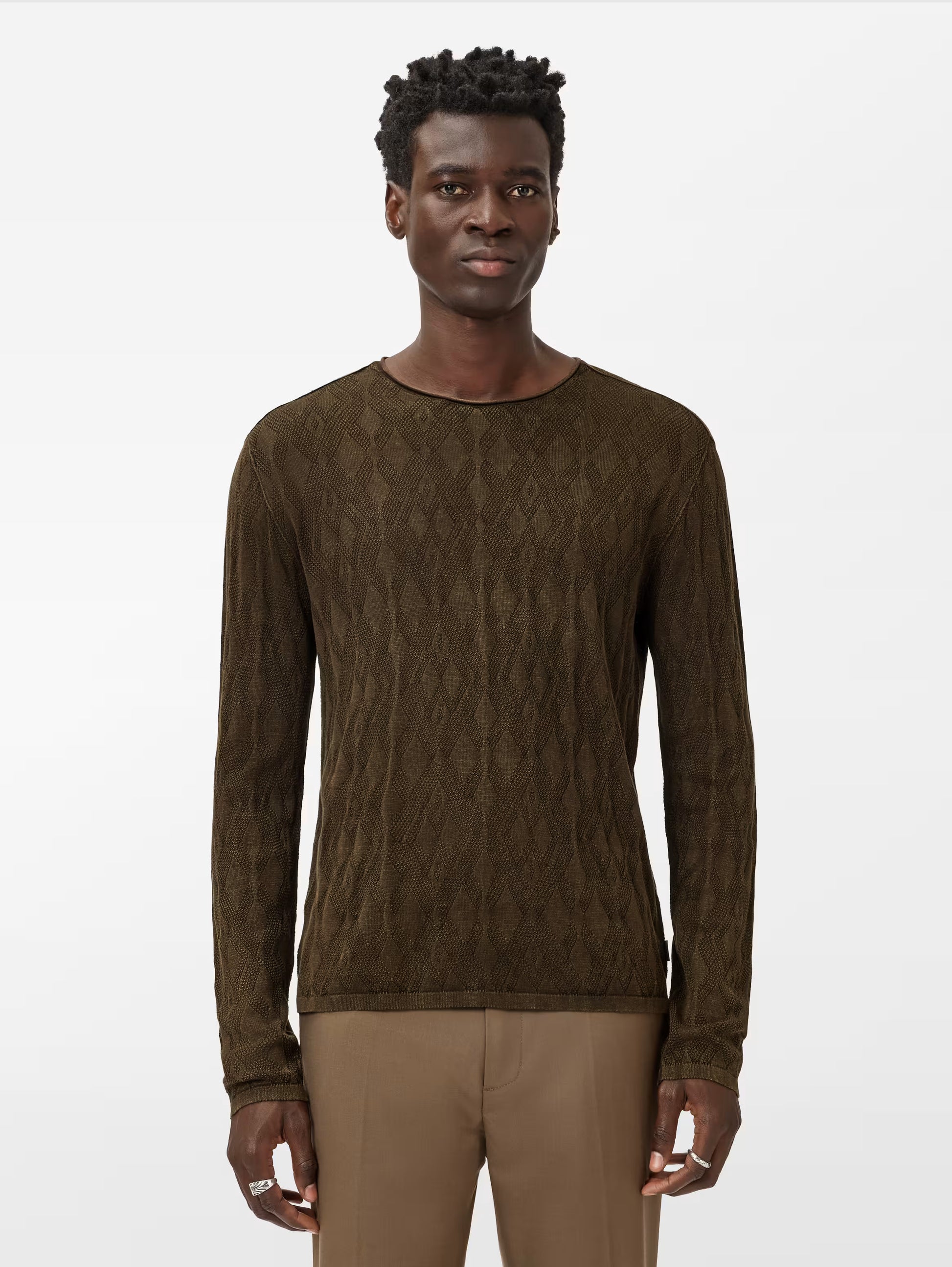 Play up your style with the Brycen Crew Teakwood by John Varvatos! This cozy pullover showcases a geometric jacquard stitch in a fun broken argyle pattern, made even cooler by a vintage wash that adds rich texture. Crafted from soft mercerized organic cotton, it features a subtle roll neck and forward shoulder seams for a relaxed, polished look. Perfect for those who love a mix of classic vibes and laid-back flair!
