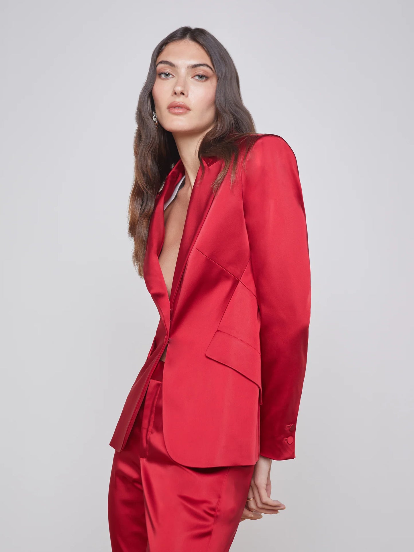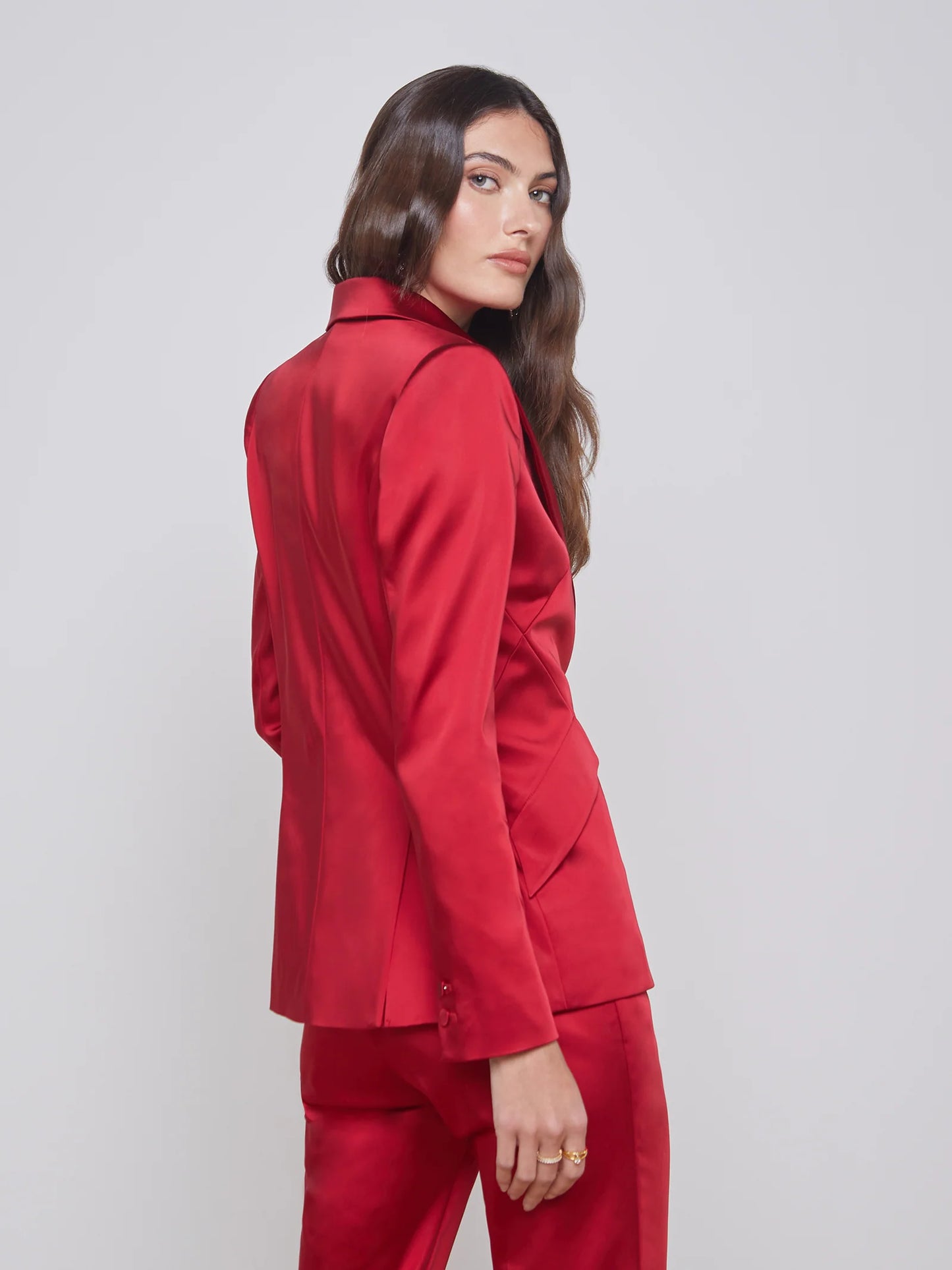 Look sharp in this luxurious Chamberlain Blazer. This expertly tailored single-breasted beauty is made with a lustrous dark-red stretch satin, creating a chic shape featuring strong shoulders, peaked lapels, and angled flap pockets. A single self button fastens in front, while the expertly handled seaming accentuates your curves. Who says you can't be stylish AND comfy?