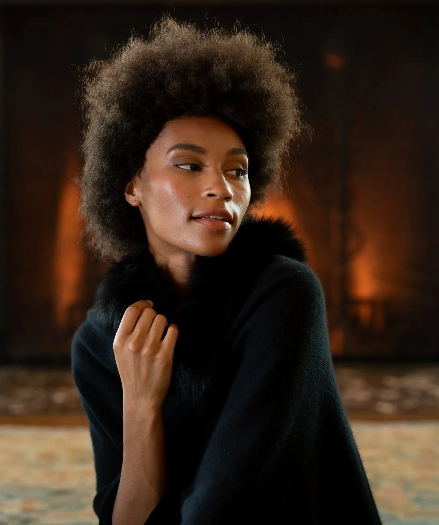 100% Cashmere Luxe Poncho With Fox Trim Ebony - Jackie Z Style Co
