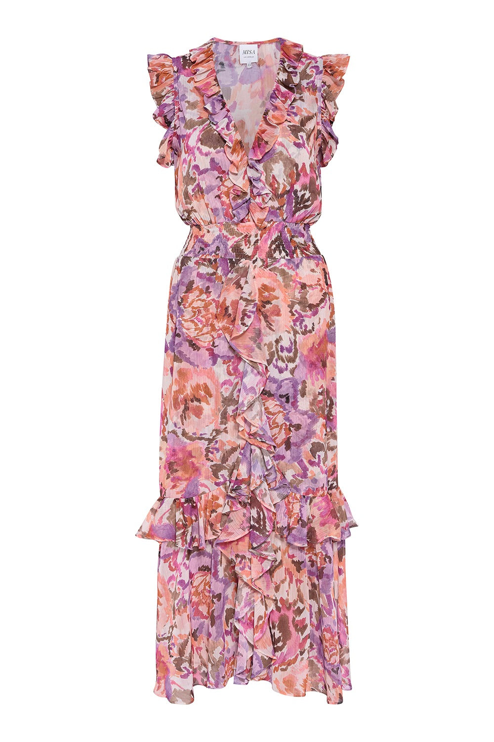Feel the warmth of the summer sun with the MISA Kidada Dress. This chic and stunning dress features a sunset floral print, v-neckline, and flirty ruffles. The hidden hook and eye closure with a ruffle trim flatters your silhouette, while a smocked waistband and cascade ruffle skirt create a cinched shape that moves with you. Perfect for any moment, this dress is sure to make a statement!