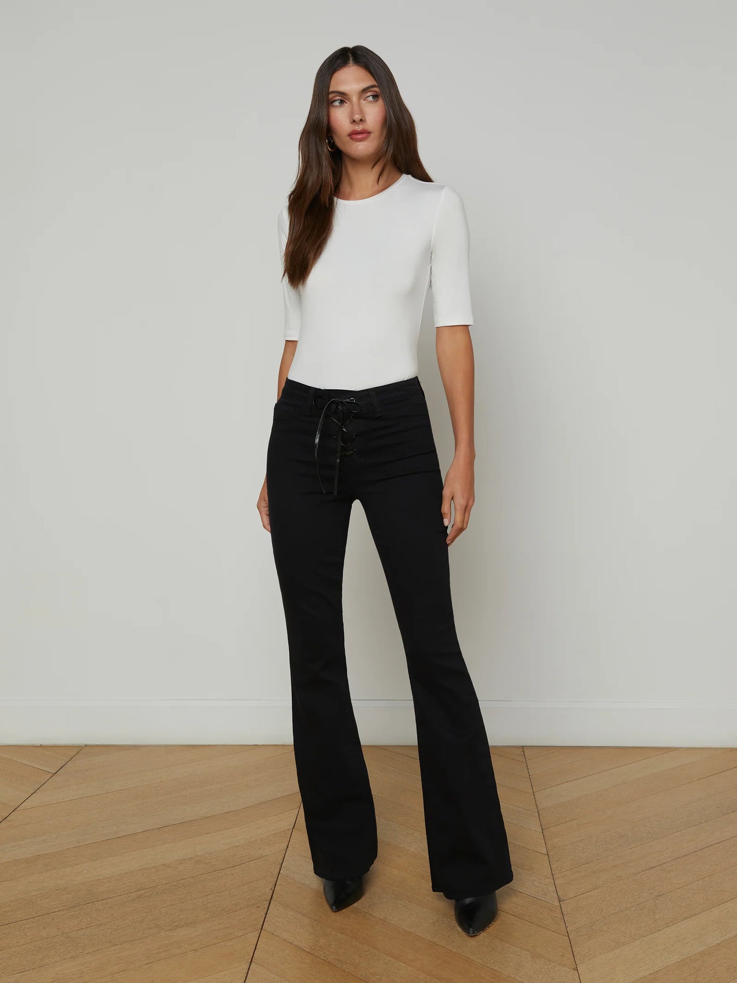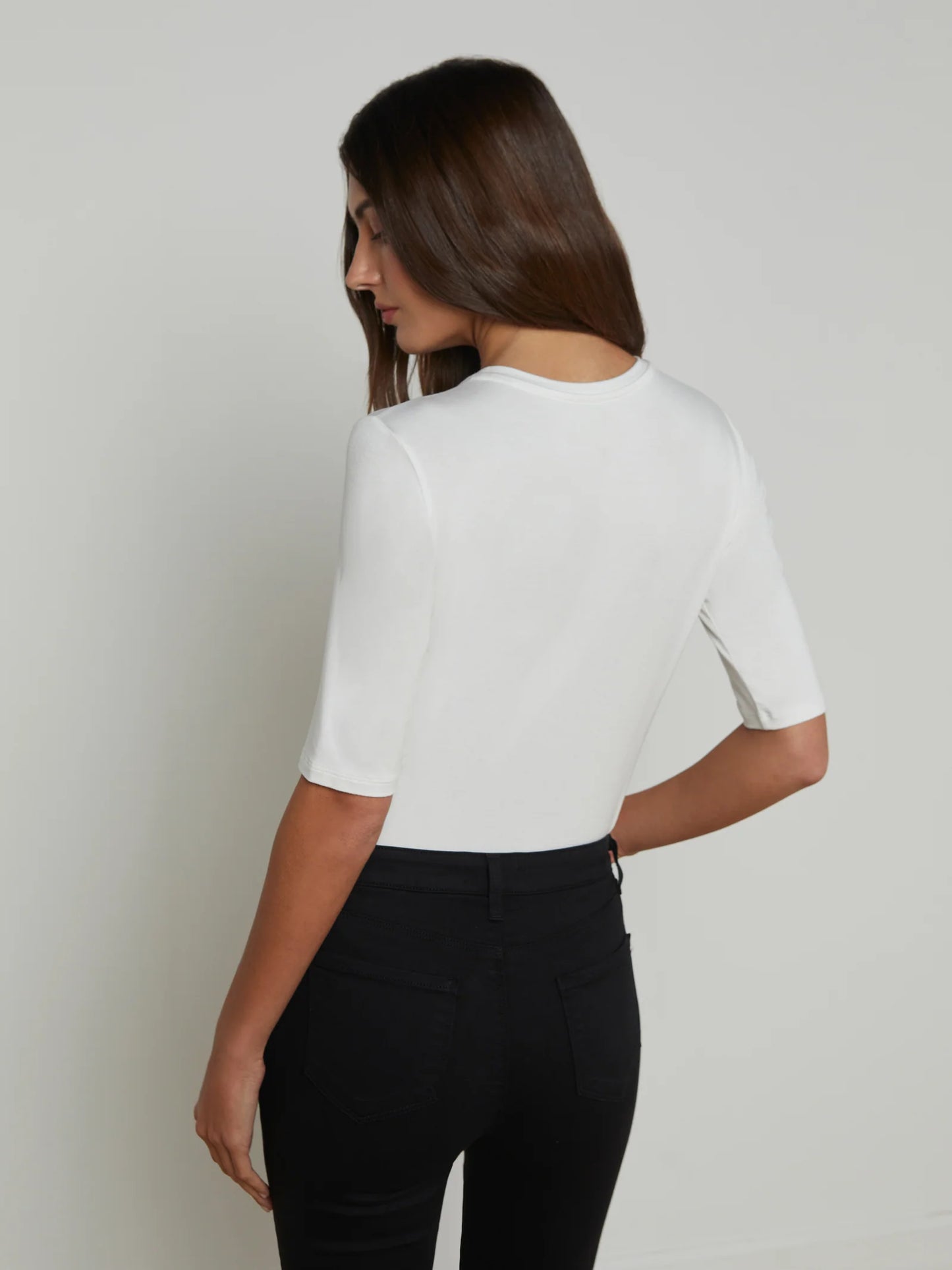 Elevate your wardrobe with the Saundra Jersey Tee White from L'AGENCE. Made from our softest microfiber modal jersey, this essential tee offers unparalleled comfort and style. With a classic crew neck and semi-fitted design, it's perfect for any occasion. Did we mention the half-length sleeves? Grab yours now in classic white!