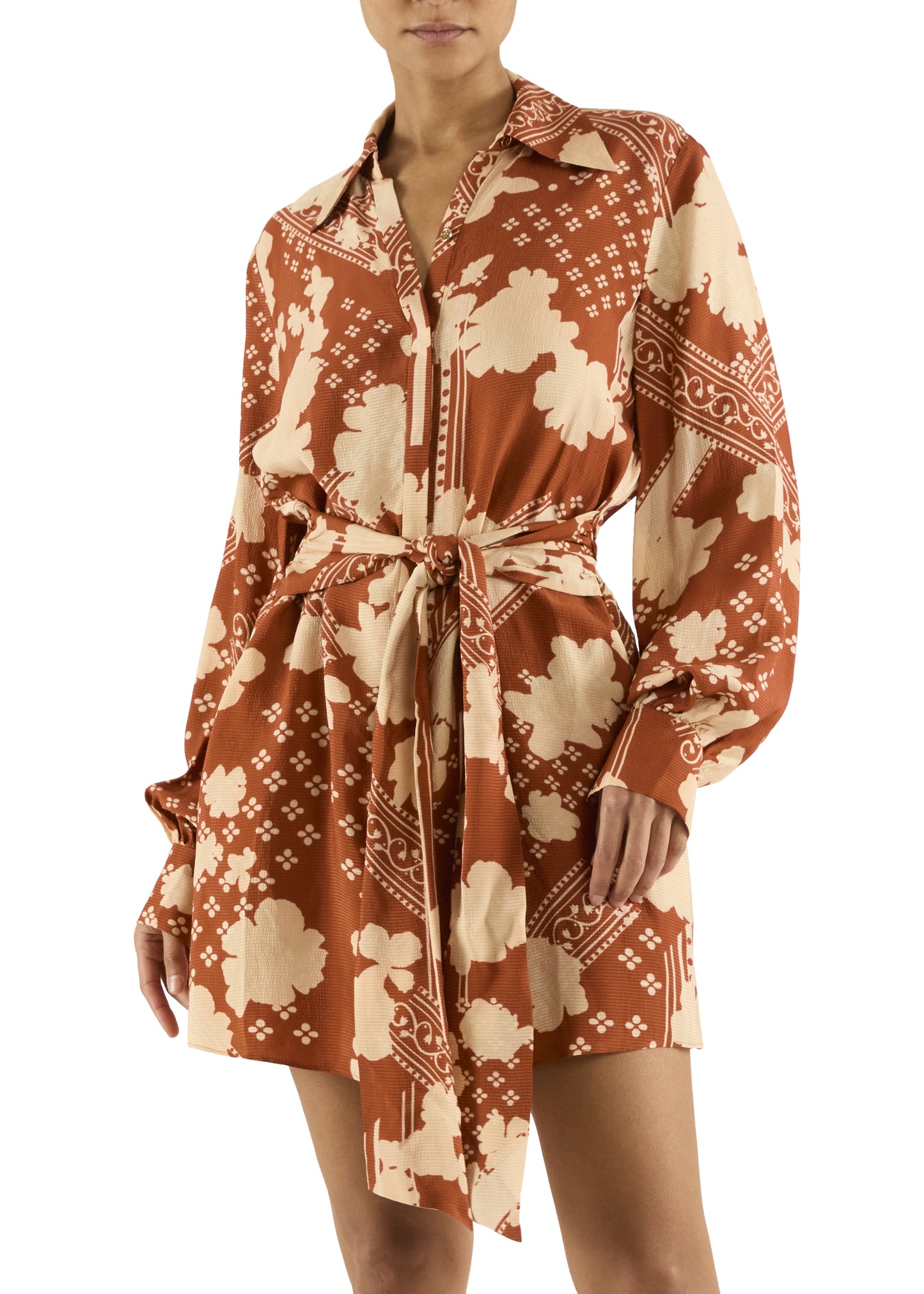 Step out in style with the Ada Dress Amber Combo by Ramy Brook. This playful mini dress features long sleeves and a button-front with a hidden placket for a sleek look. The elastic back waist and attached self-tie create a flattering silhouette, while the classic collar adds a touch of charm. Perfect for any occasion where fun meets fashion!