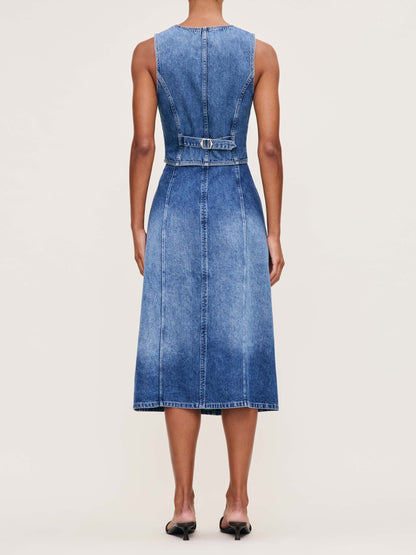 Get ready to rock the retro look with Alma Denim Skirt Button Front Wythe by DL1961! This A-line skirt sits at your natural waist, giving you a flattering silhouette. The bright mid-indigo wash with gold hardware and subtle fading adds a touch of vintage charm. Perfect for any occasion!