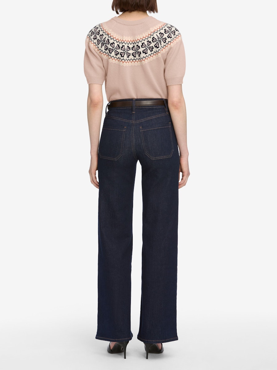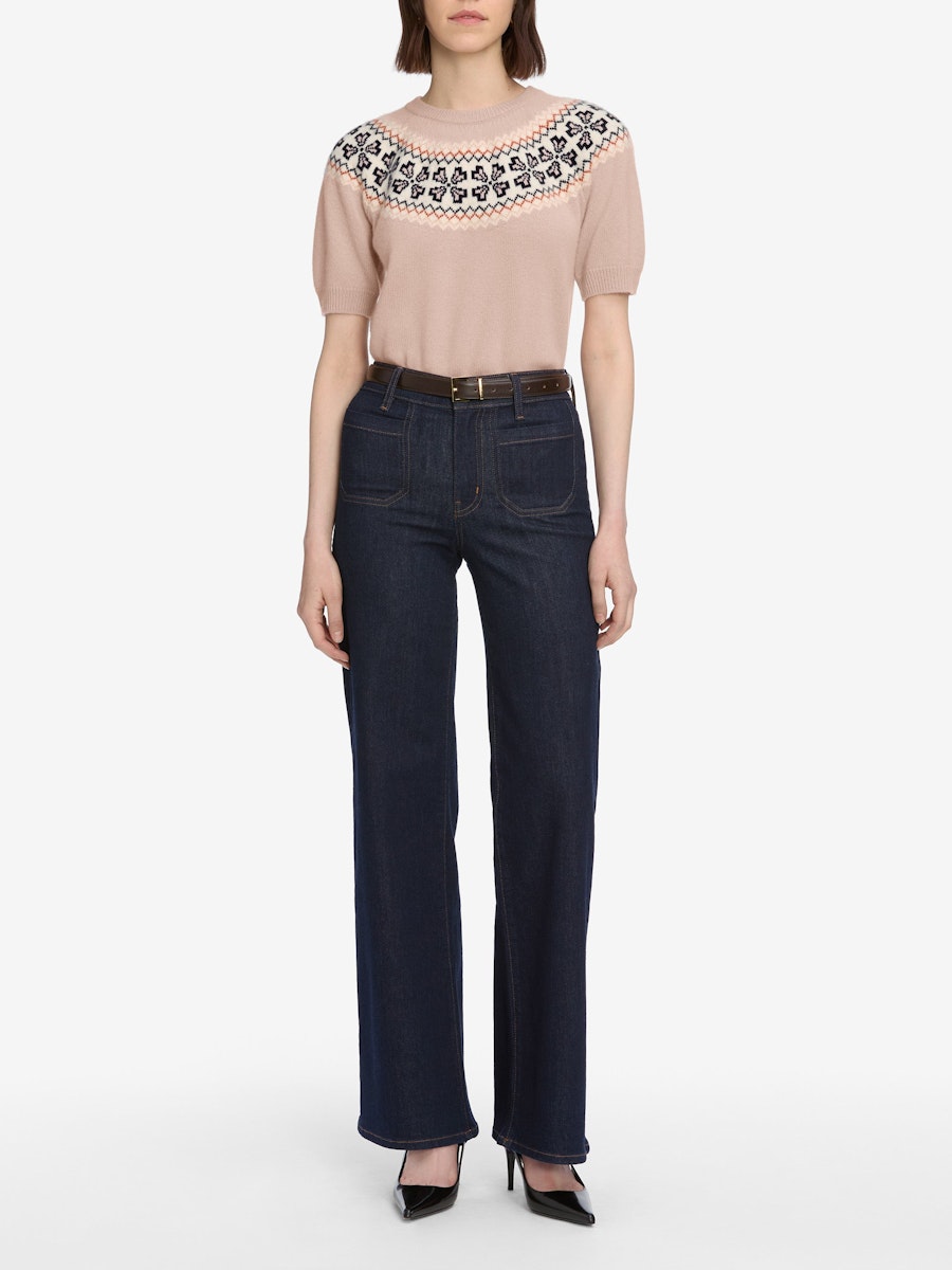 Add a playful twist to classic knitwear with this short sleeve Fair Isle sweater in soft pink cashmere. Its charming pattern and cozy feel bring delightful character to your outfit, making it perfect for those who love a touch of whimsy in their wardrobe.