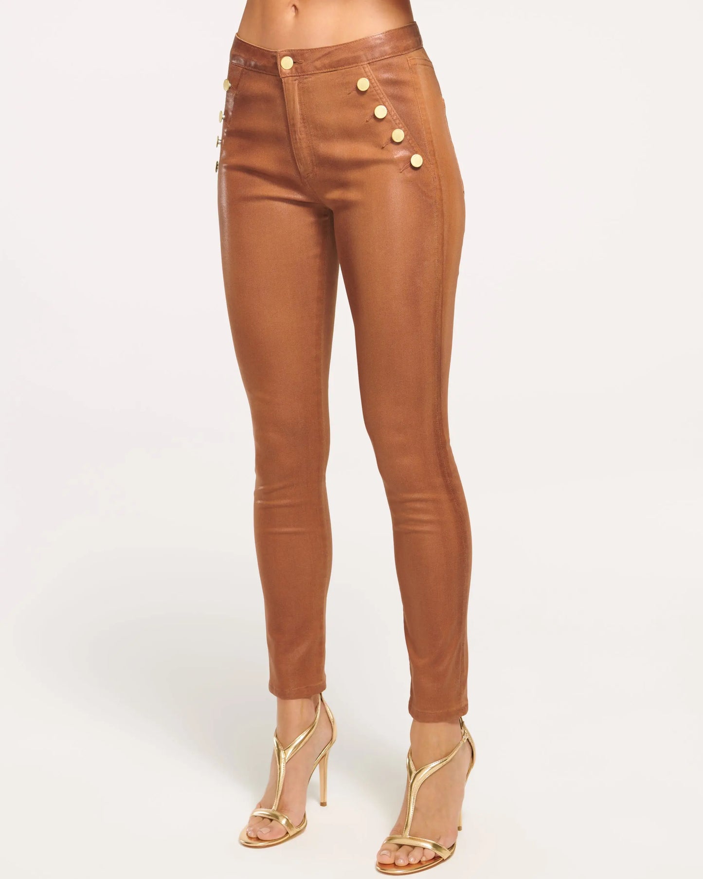 Achieve a slim fitting, curve loving look with the Coated Helena Skinny, a chic pair of copper denim that's the perfect start for any outfit. The mid-rise silhouette has stylish gold buttons for a gilded touch, while the skinny cut pairs well with an oversized knit and cropped top alike.