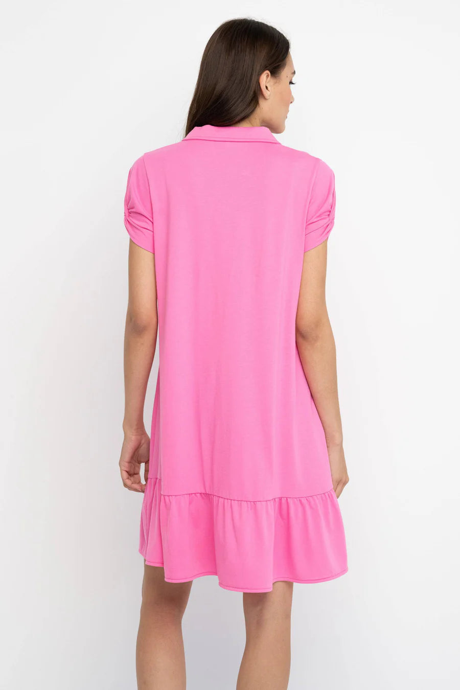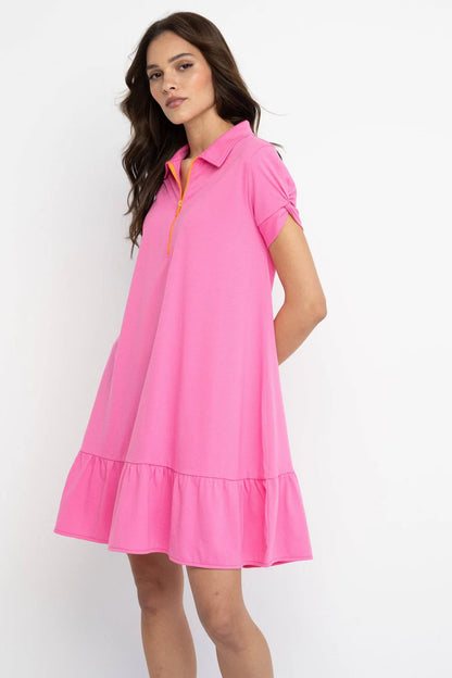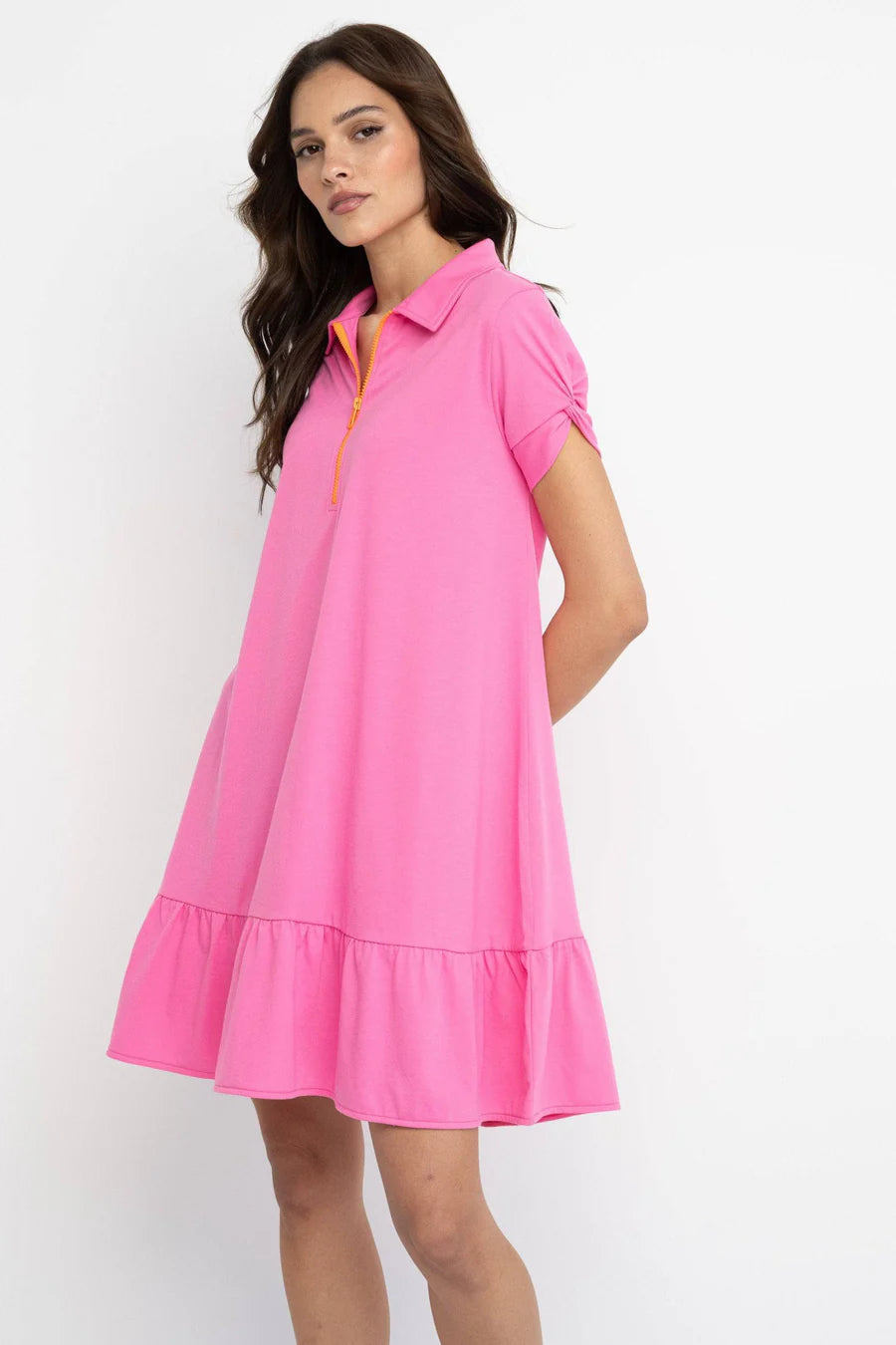 This playful Courtside Dress Passion by Lisa Todd features a comfy cotton blend with a chic polo collar and a fun contrast zip-up closure. The knitted short sleeves add a cozy touch, while the A-line silhouette with a flirty hem ruffle brings movement and charm to your look. Perfect for turning heads on and off the court!