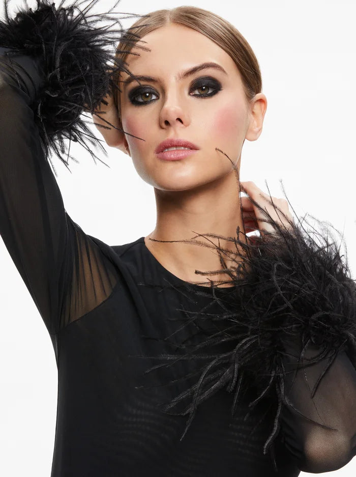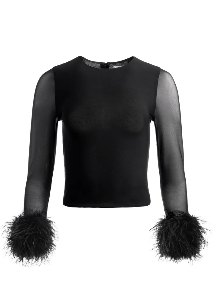 Delaina Feather Cuff Sleeve Top Black - Alice + Olivia