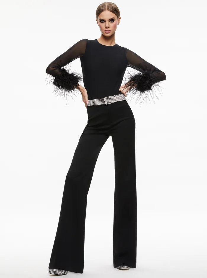 Unique and fashion-forward, the Delaina top from Alice + Olivia is sure to be a showstopper. This cropped piece has a sleek black design and features feather-trimmed cuffs for an eye-catching twist. Stand out from the crowd and make a statement with this top.
