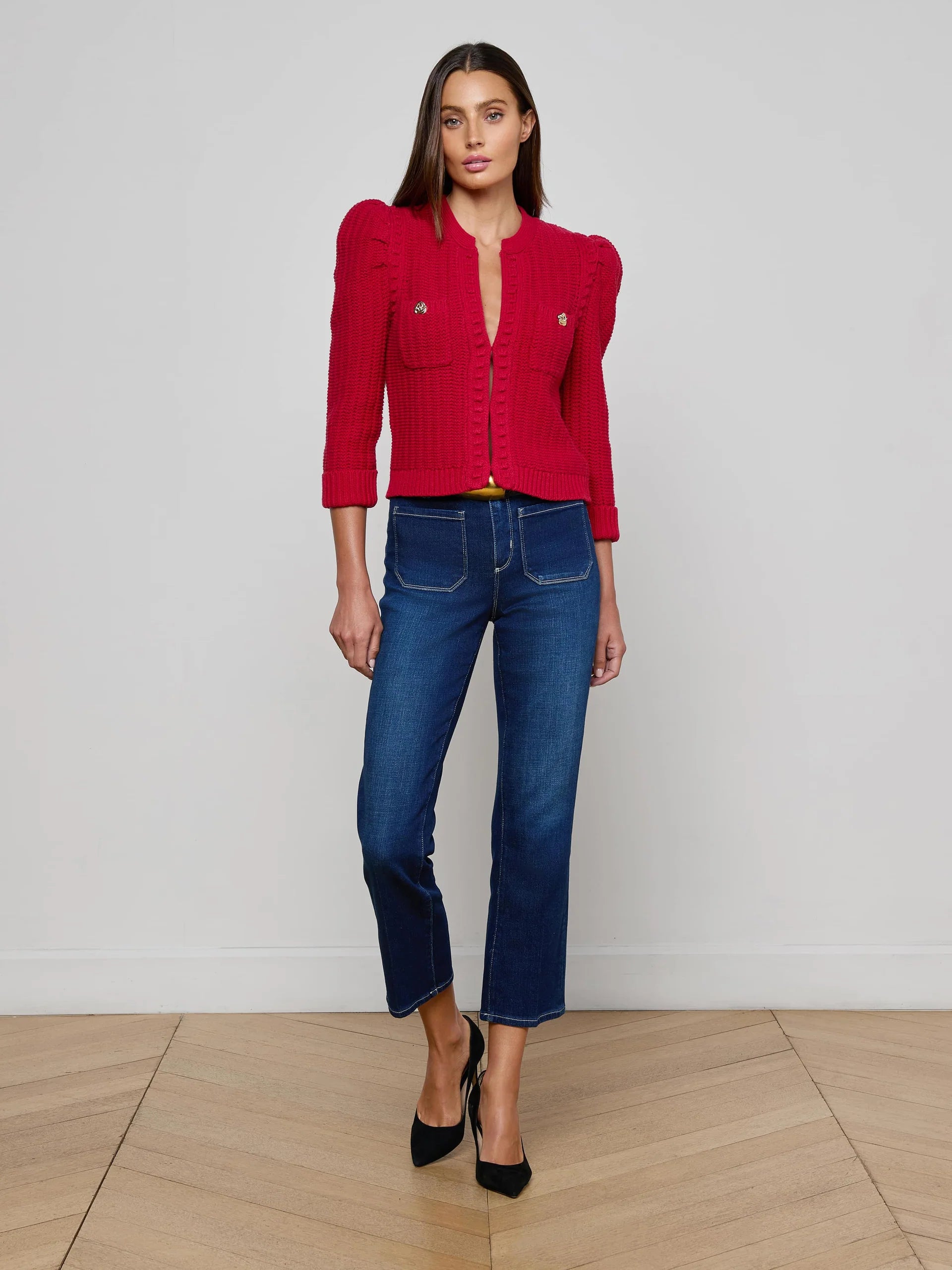 The Delli Cropped Cardigan in Engine Red brings a playful twist to your wardrobe with its richly textured knit and sculpted puff shoulders. Featuring luxe gold crest buttons on chest pockets and updated three-quarter sleeves, this boxy, cropped piece is perfect for layering. Wear it open with your favorite tank and denim for a casual vibe, or button it up with trousers for a chic evening statement.