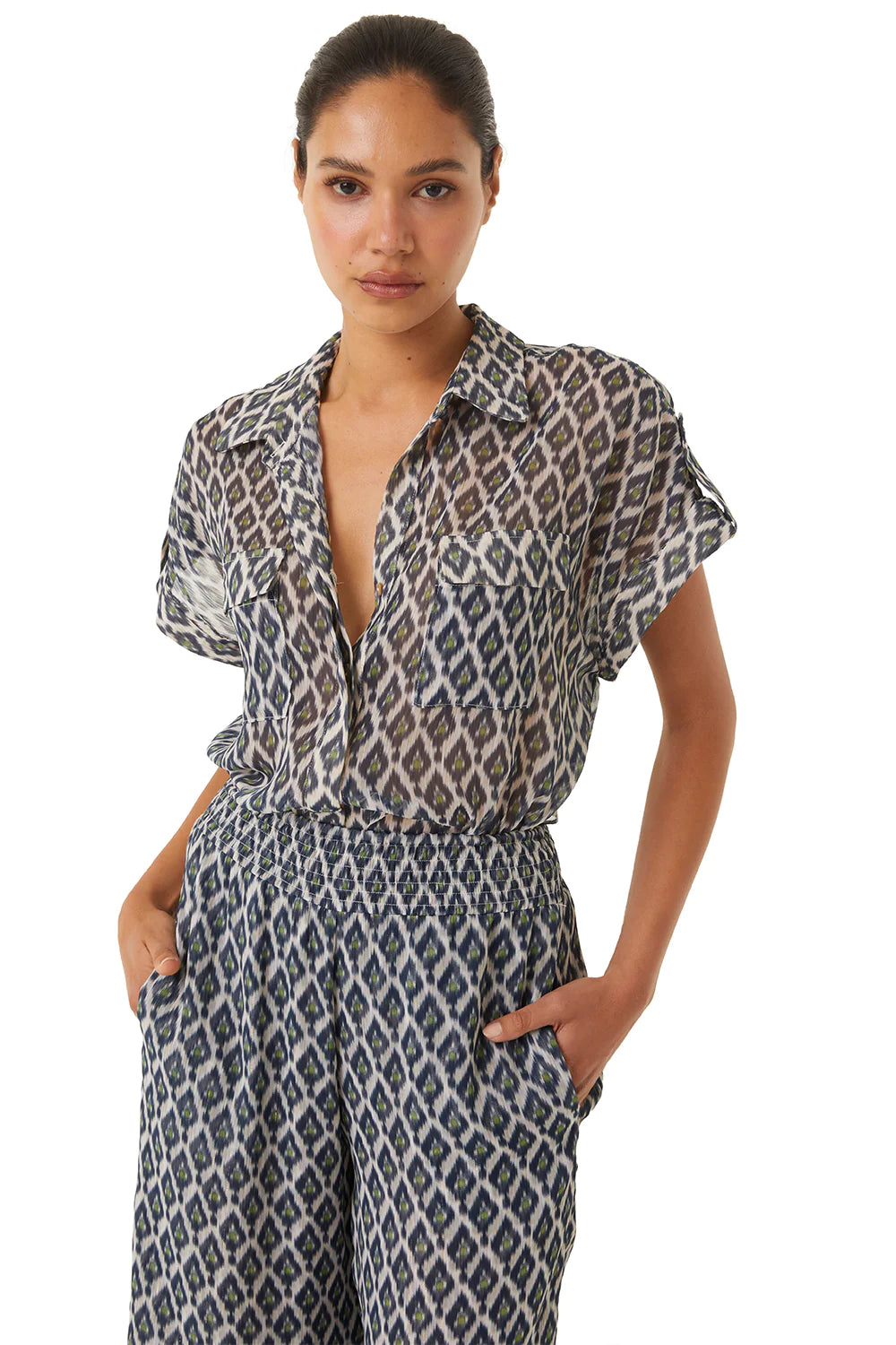 Effortlessly chic, the Erin Top in peridot eyes print with lurex details offers a playful twist to your wardrobe. This semi-sheer boxy silhouette boasts short rolled sleeves with epaulets, a covered front button placket, and a fold-over collar. Complete the look with the coordinating Freda pant.