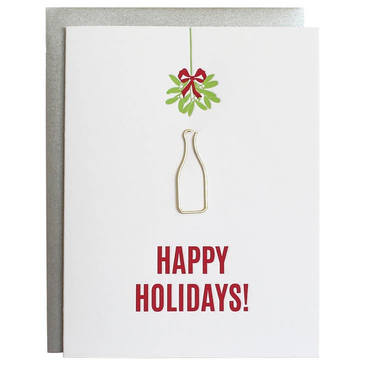 Our "Happy Holidays Mistletoe" paper clip card is printed on a vintage printing press. Card includes a heavy duty gold champagne bottle paper clip.