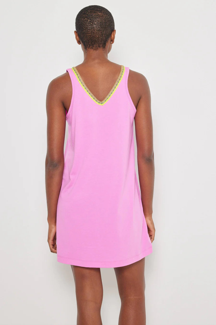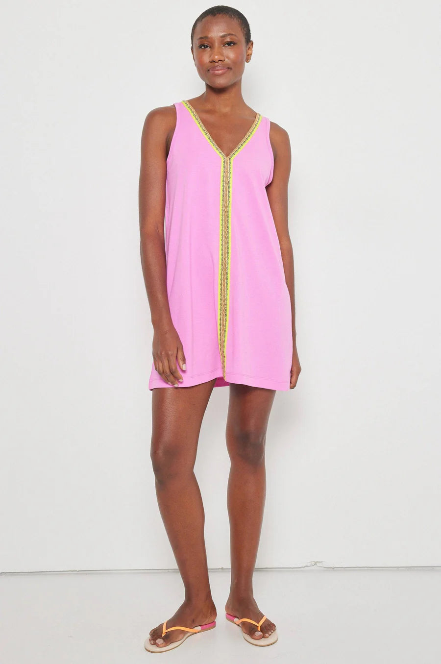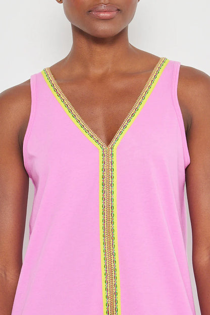 This sleeveless V-neck tunic dress brings a fun twist to your wardrobe with its playful embroidered trim that pops along the neckline and center front. Perfect for layering or wearing solo, it’s a breezy, stylish pick that keeps things light and lively wherever you go.