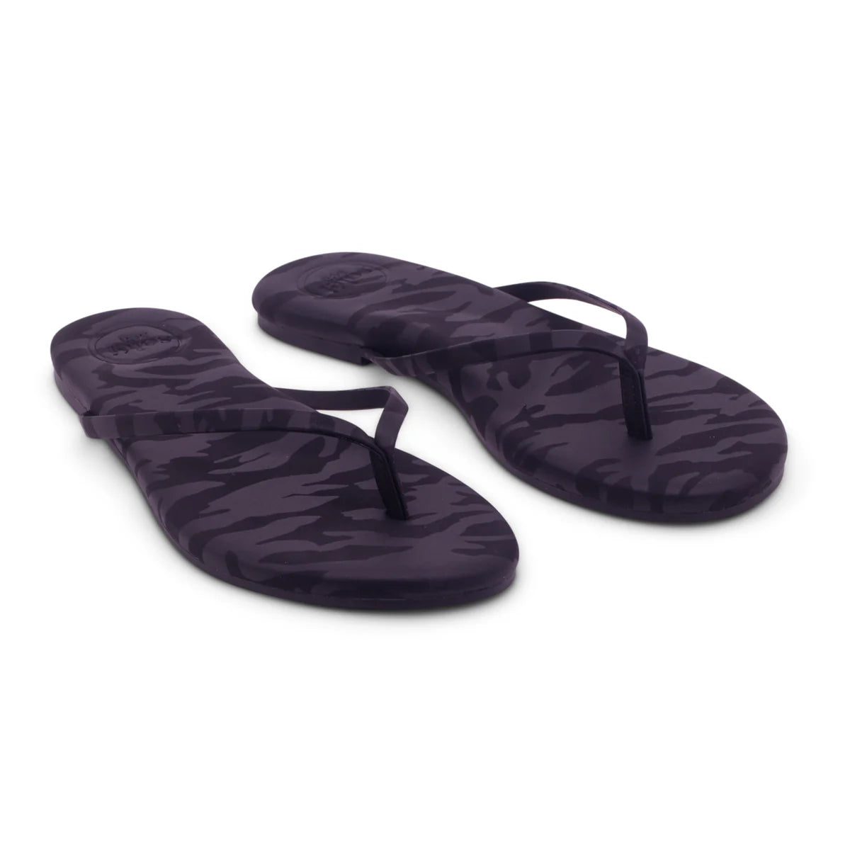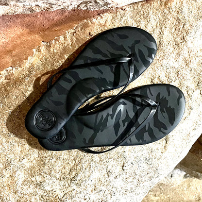 Step into effortless style with the Indie Camo Metallic Noir from Solei Sea. These flip-flops blend sleek, narrow straps with a slim sole for a chic, minimalist look. Enjoy cushioned comfort and padded arch support that keep your feet happy all day. The non-slip rubber bottoms, featuring our signature Soléi waves, and water-resistant vegan leather make them perfect for beach days, brunch dates, or anywhere your adventures take you. Elevate your casual vibe with a playful twist on a classic favorite!
