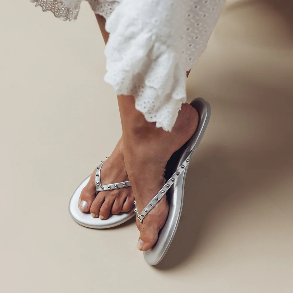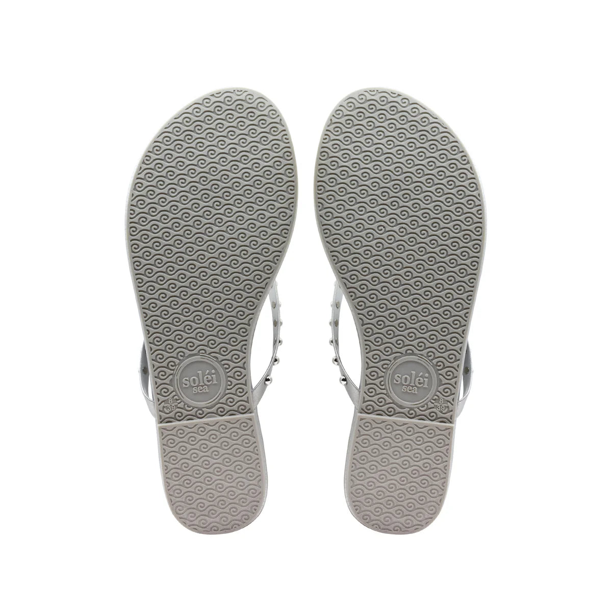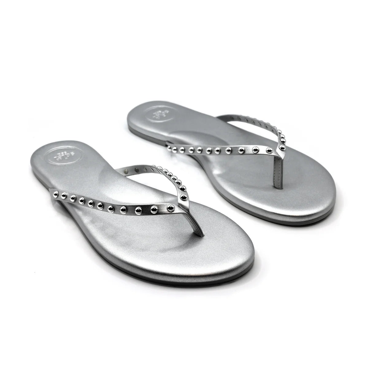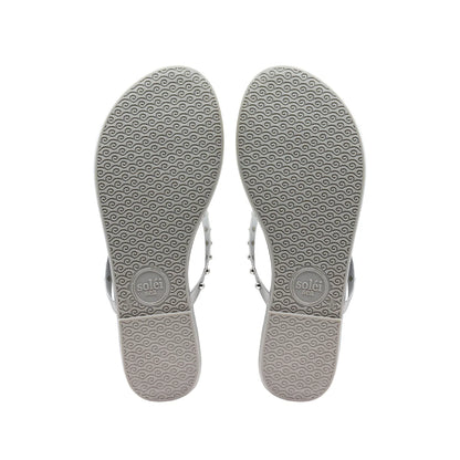 Step into effortless style with the Indie Soho Silver W/ Studs from Solei Sea. These flip-flops blend sleek, narrow straps with a slim sole for a chic, minimalist look. Enjoy cushioned comfort and padded arch support that keep your feet happy all day. The non-slip rubber bottoms, featuring our signature Soléi waves, and water-resistant vegan leather make them perfect for beach days, brunch dates, or anywhere your adventures take you. Playful, practical, and oh-so-comfy—these sandals are your new go-to for sunny vibes!