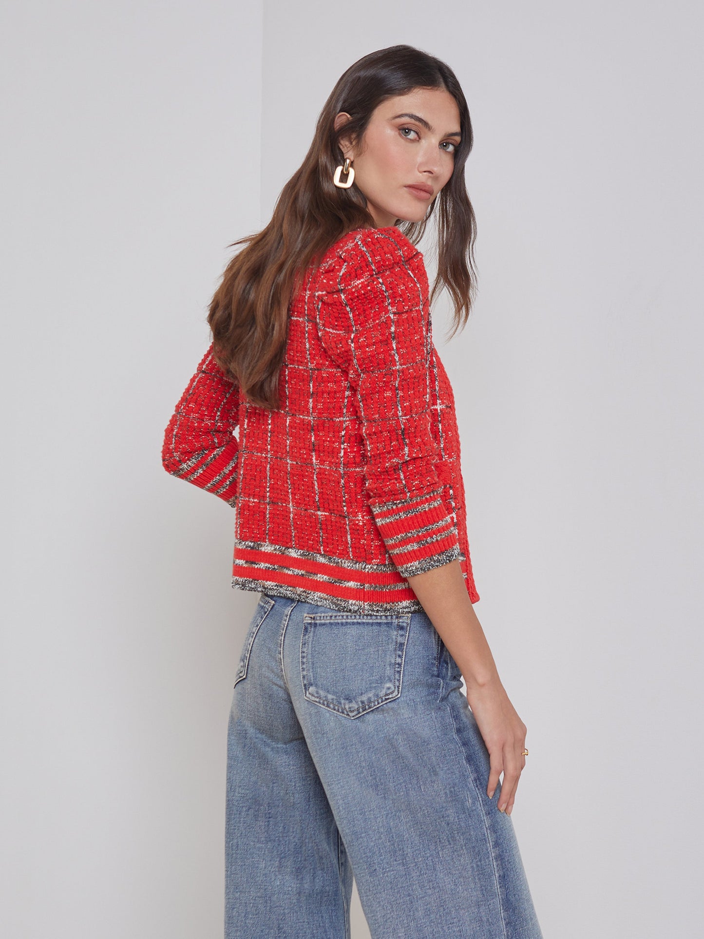 Fall in love with this stunning Jenni Cardigan Red Multi from L'AGENCE. This chic V-neck cardigan has a textured premium waffle knit with pleated puff shoulder and patch pockets. The striped hem and cabled neckline add unique visual contrast and the embossed-dome button accents finish off the piece with a touch of glamorous shimmer.