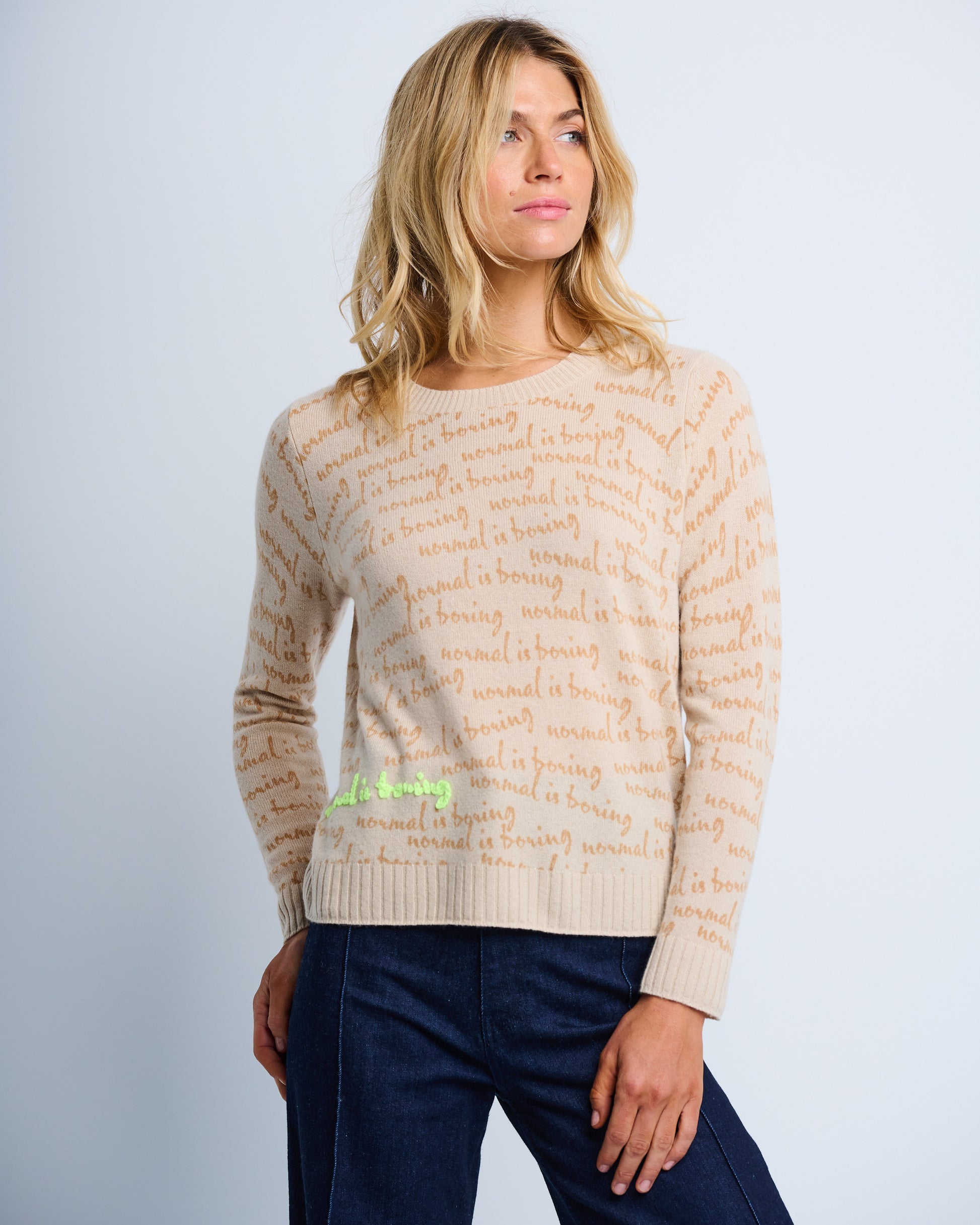 Embrace the fun side of fashion with the "Normal Is Boring Latte" crew neck sweater by Lisa Todd. Featuring long sleeves and a cozy fit, this sweater playfully declares your unique style with a standout “normal is boring” print, highlighted by eye-catching embroidered neon details. Perfect for those who love comfort with a splash of bold personality.