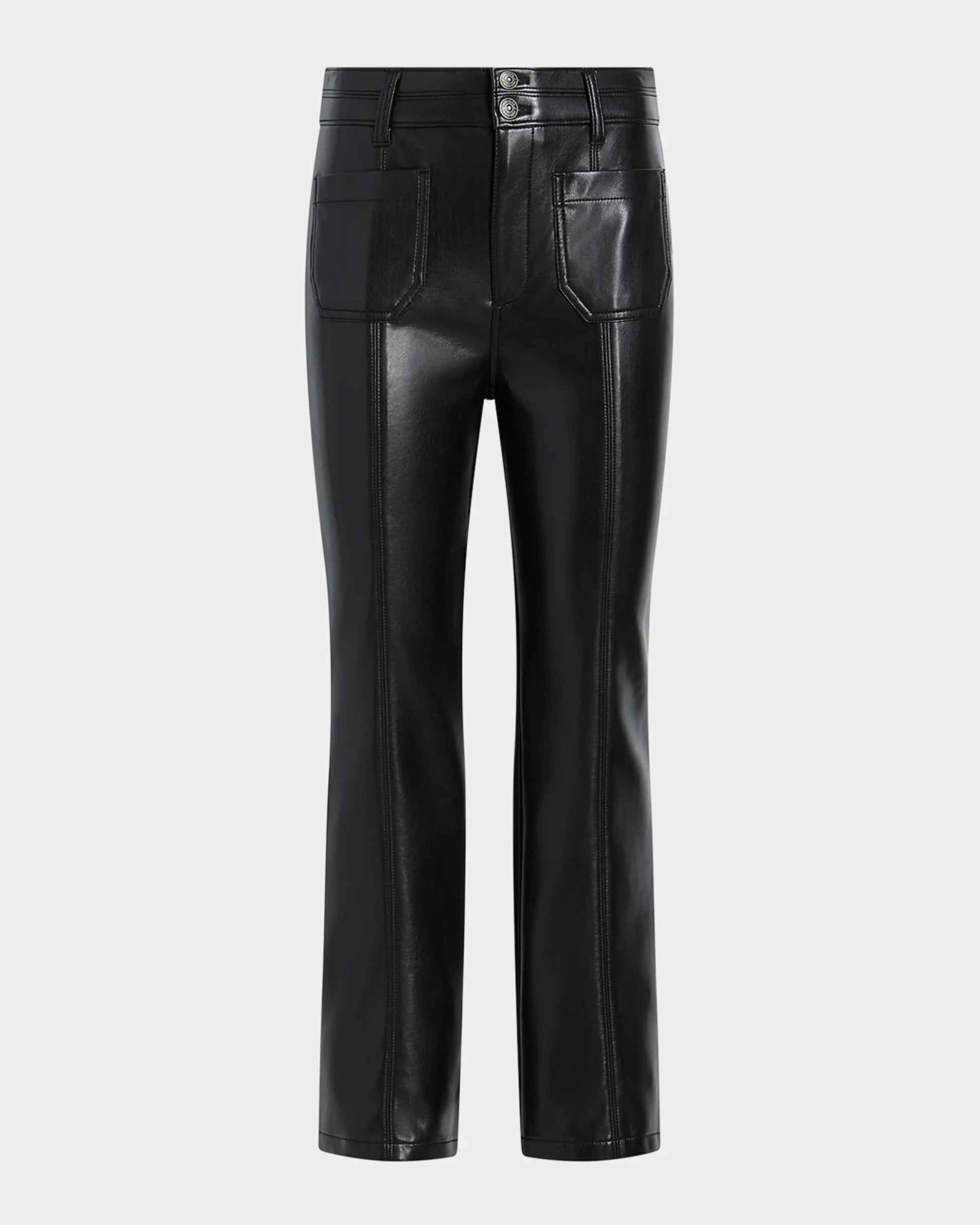 Elevate your wardrobe with the Dorothea Pant—a vegan leather stunner that's part retro, part modern magic. This high-rise wonder features a cropped, flared cut that elongates your legs and turns heads. Practical front patch pockets keep your phone and keys safe, while the zip fly and button closure deliver a secure fit every time. Crafted from buttery-soft vegan leather, these pants feel as good as they look. Perfect for pairing with everything from crop tops to oversized blazers, the Dorothea is your ticket to effortless, playful style that actually works.
