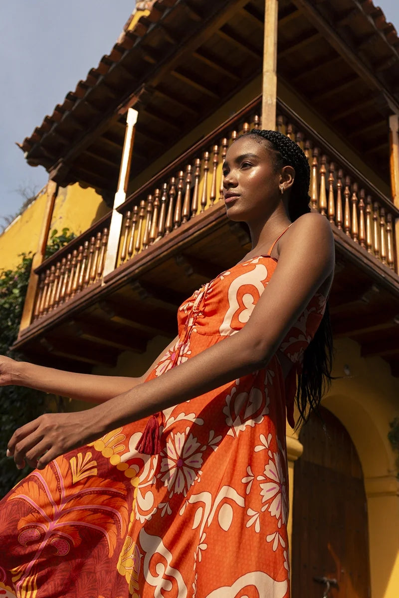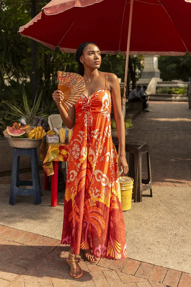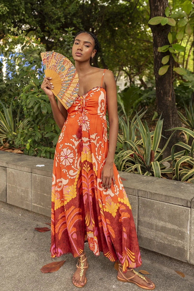 Indulge in the enchanting Wilma Long Dress Orange by Miss June. In a joyful orange floral hue, this dress will transport you to a bohemian paradise with its adjustable neckline and delicate tie, offering customization and a touch of mystery to your unique style and relaxation.