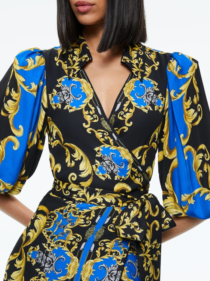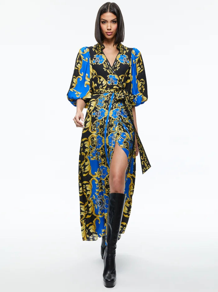 Experience a unique twist on the classic shirt dress! This Alisa Wrap Maxi Shirt Dress from Alice + Olivia is both bold and beautiful. Its regal sapphire print, maxi length and long sleeves bring an effortlessly chic aura, while the collar and waist give it an extra-flattering touch. Ready to rock?