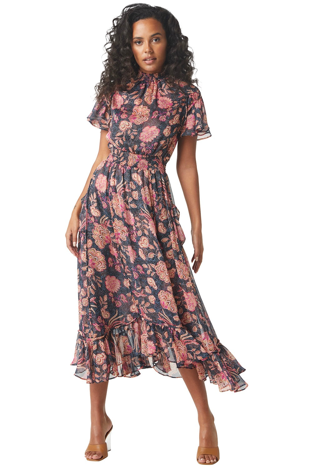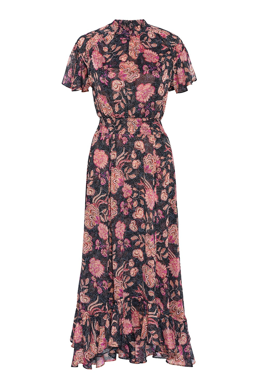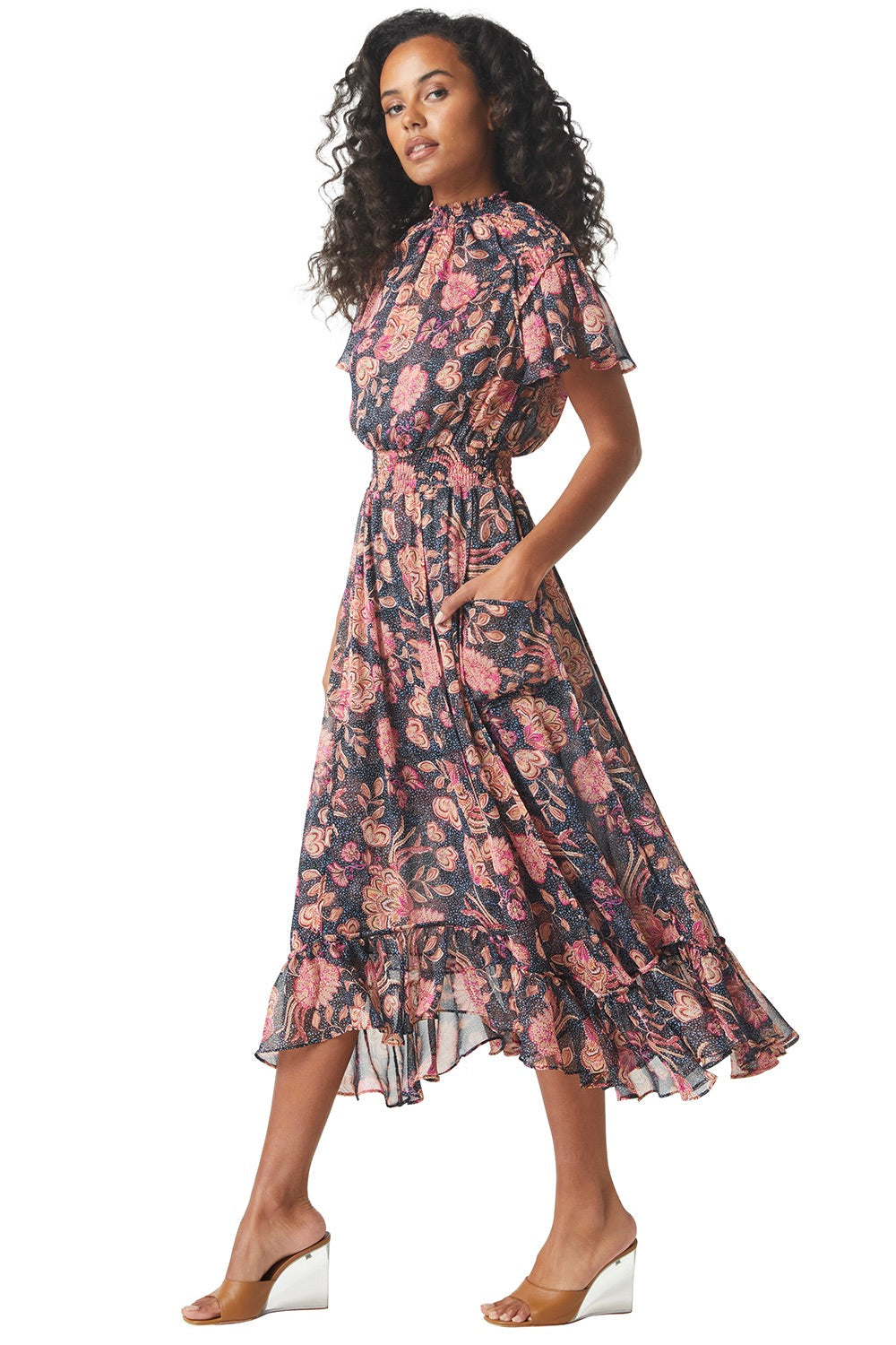 Be ready for the summer season with our beautiful Azura dress! Crafted from gorgeous navy and pink dotted floral chiffon, this midi silhouette is a must-have and features a smocked neckline, short flutter sleeves with a keyhole back closure, as well as a smocked waist and pocket details complemented by a ruffle trimmed skirt. Make a statement and show off your style!