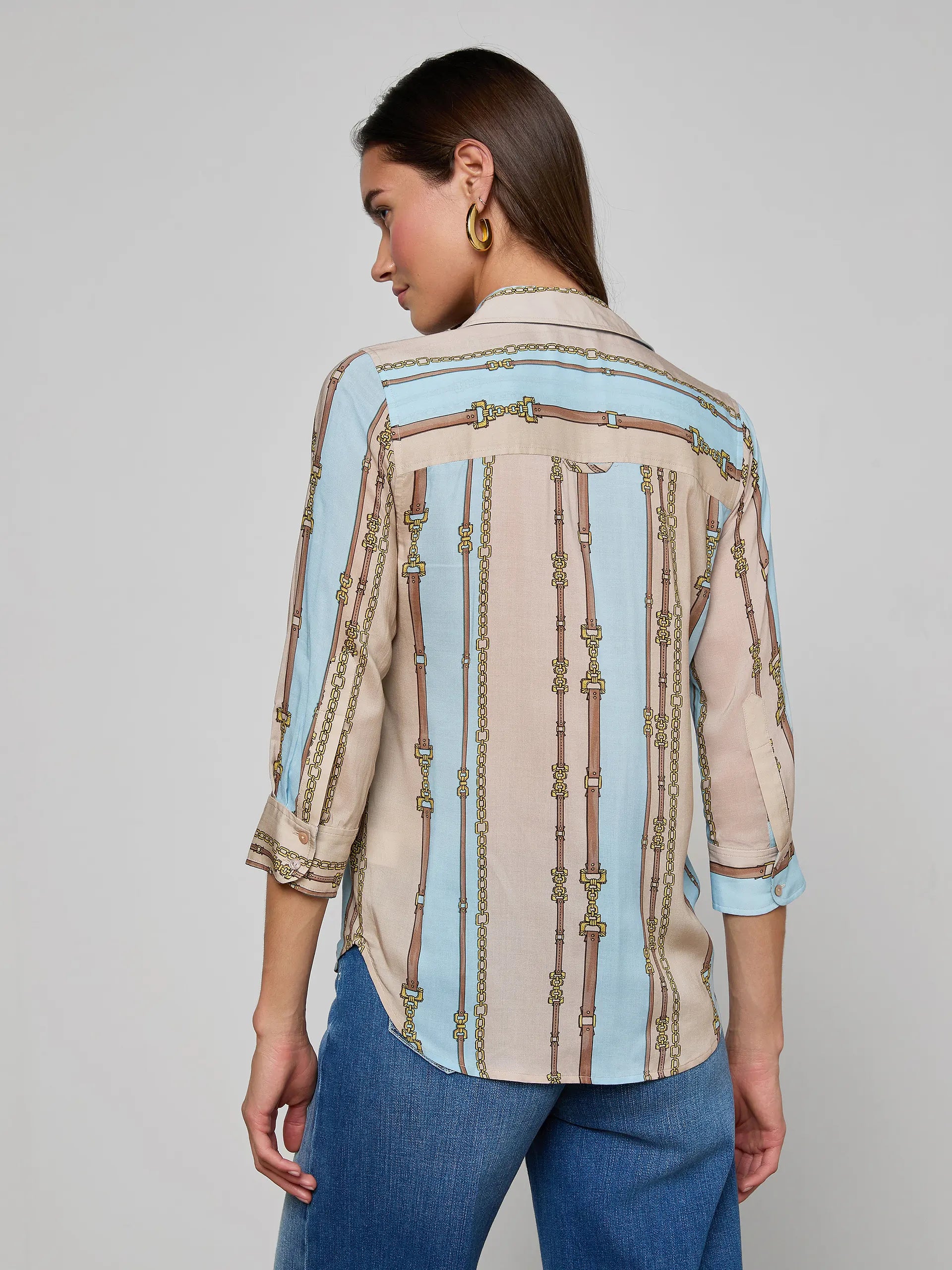 The Camille Blouse is back and better than ever in a chic belt stripe print that's equal parts sophisticated and fun. This signature three-quarter sleeve button-down features a timeless taupe and light sage colorway that pairs effortlessly with everything in your closet. Perfect for elevating your everyday look or dressing up for the office, this L'AGENCE essential delivers polished style with a playful twist.
