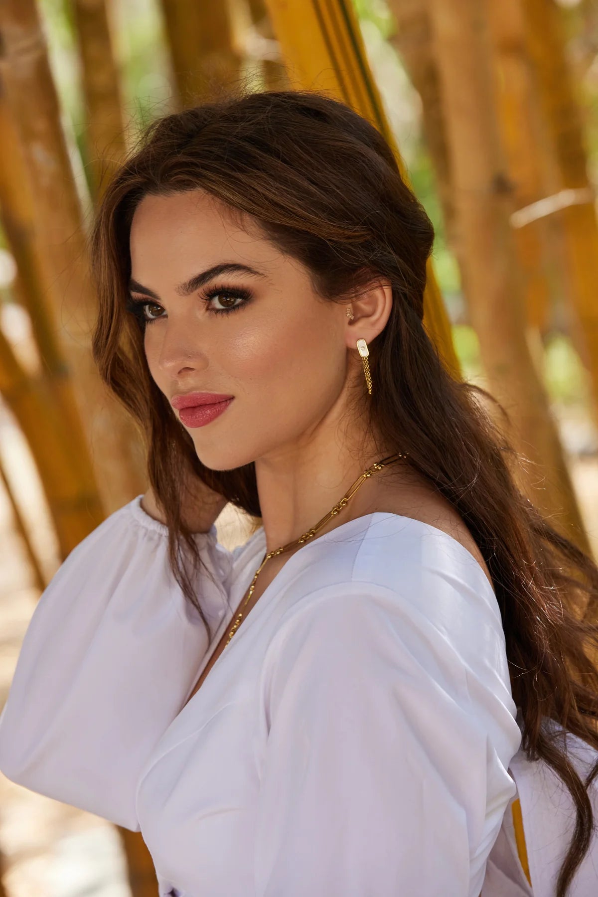 The Chained Tablet Studs Mother of Pearl by Adriana Pappas features a stunning combination of 14k gold plated brass, enamel, and CZ for a luxurious and unique look. These earrings are handmade in the USA with good vibes, making them the perfect accessory for any occasion. With a sterling silver .925 post and 14k gold plating, these earrings are not only beautiful but also high-quality. Elevate your style with these exquisite earrings.