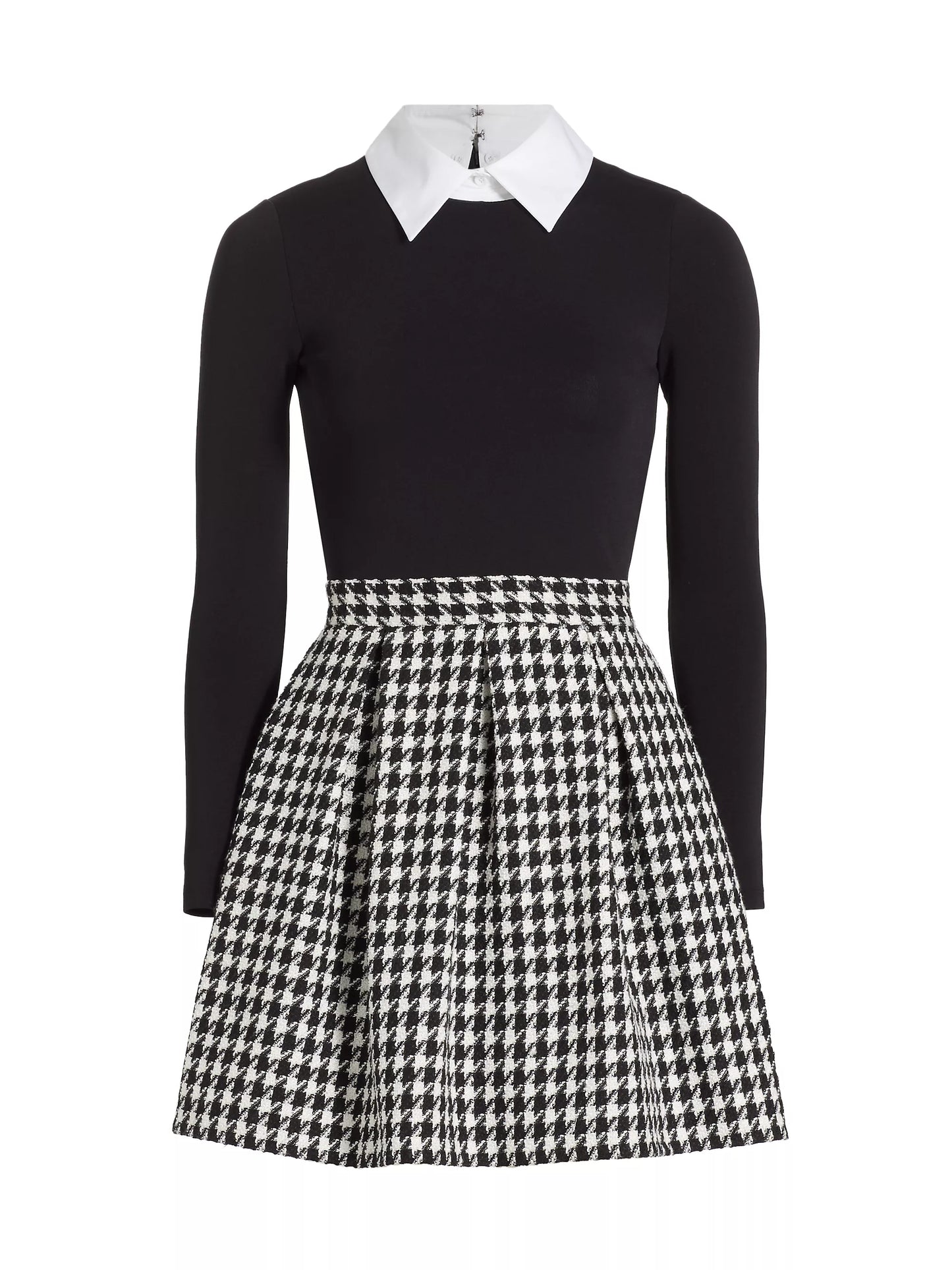 Chara Long Sleeve Pleated Dress With Collar Black & Off WhiteAlice & Olivia