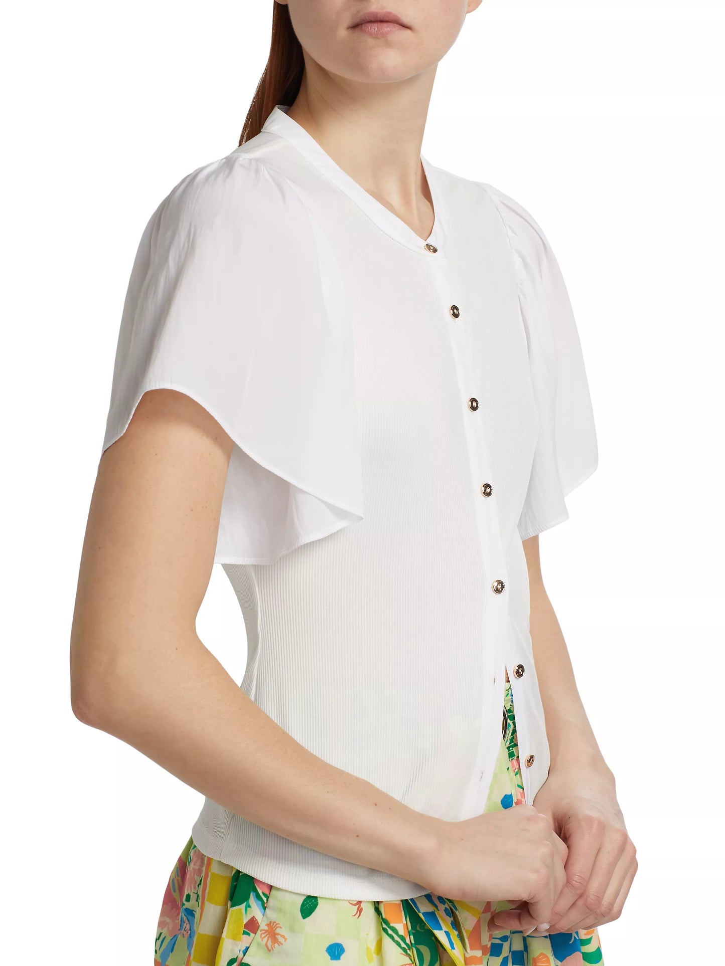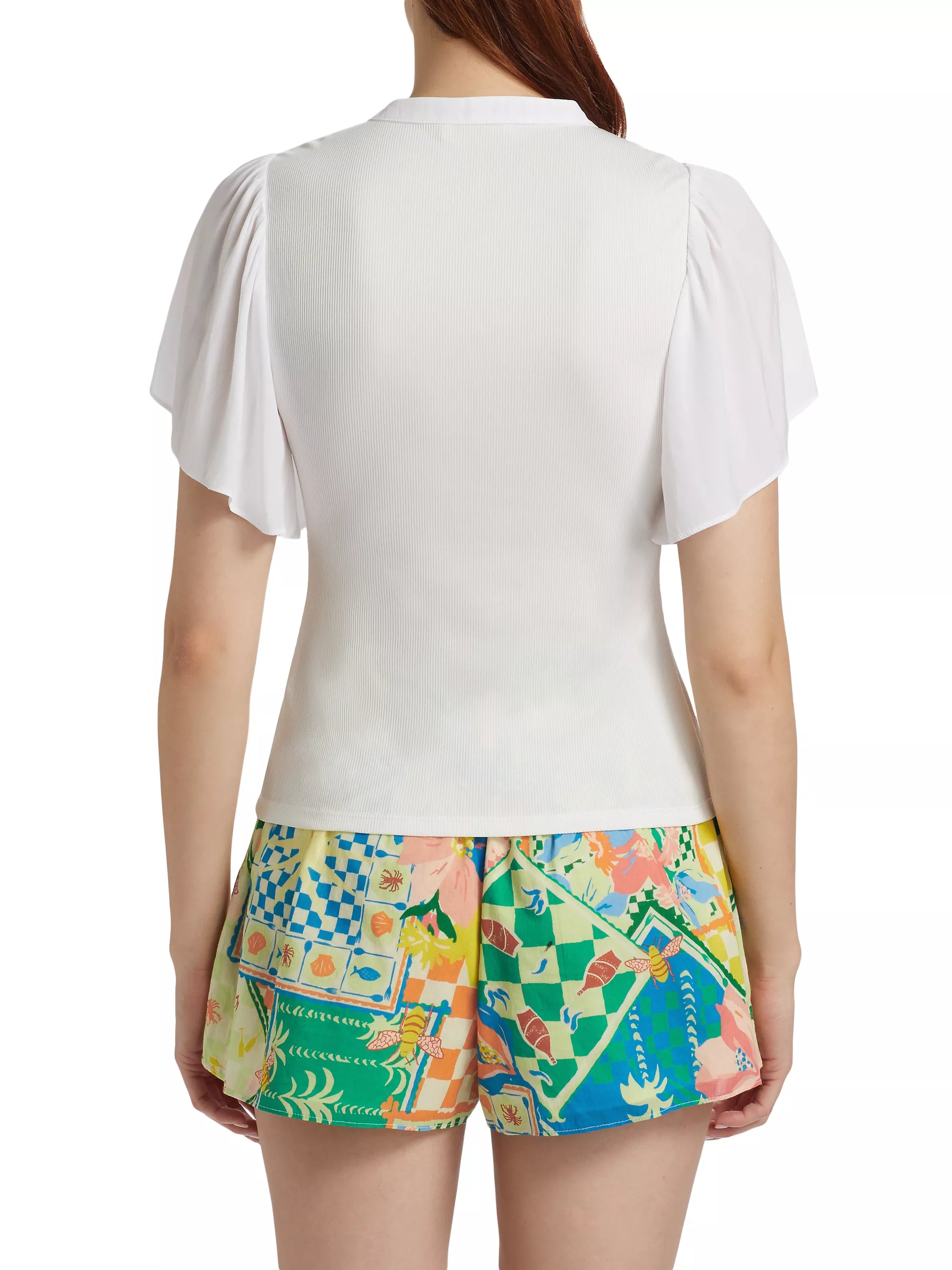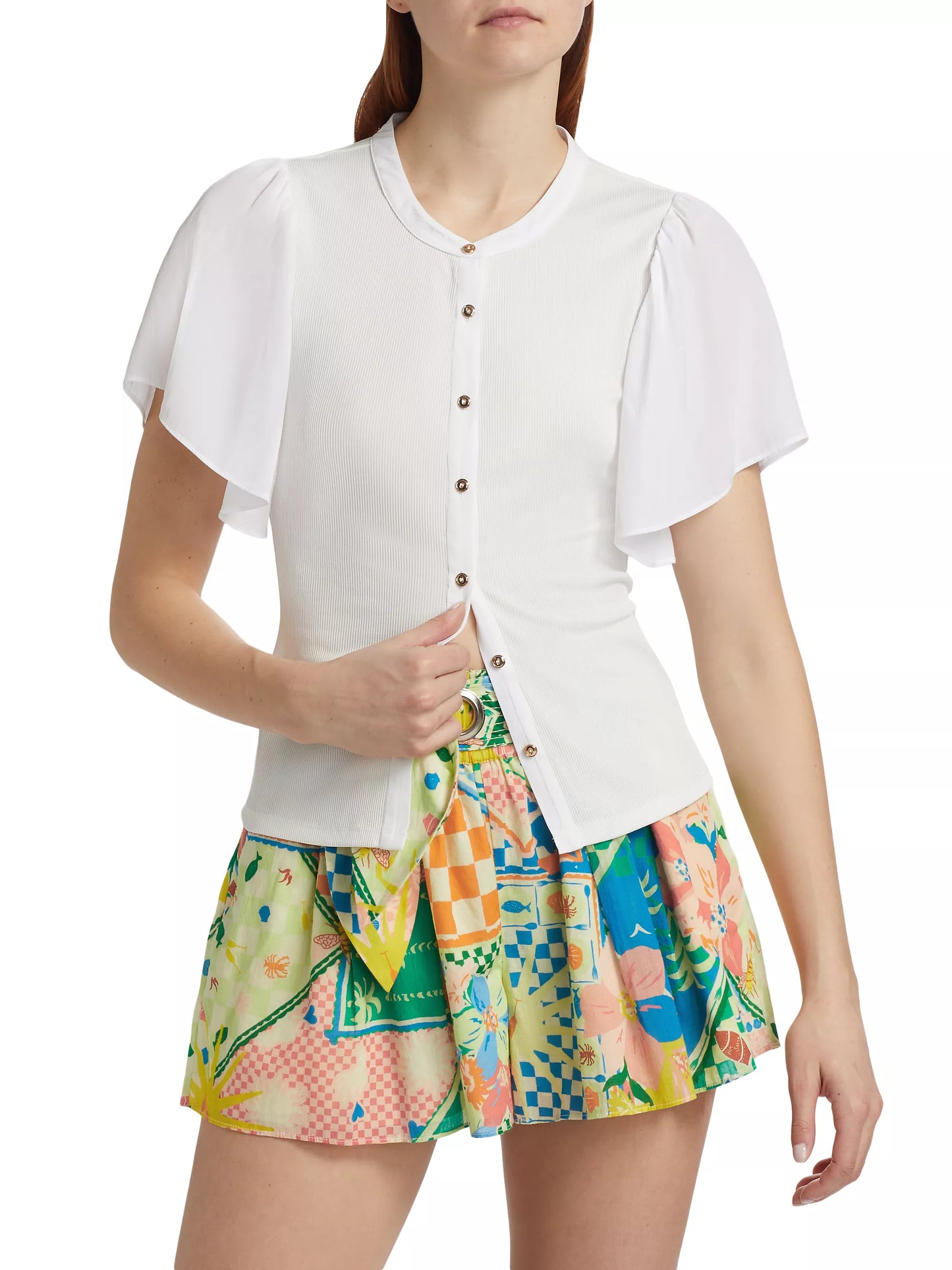Introducing the Colette Ribbed Combo Short Sleeve Top Ivory - a playful blend of ribbed knit and delicate flutter sleeves for a fitted yet flowy look. Versatile and effortlessly chic, this button-down top is perfect for work, coffee dates, or casual evenings out.