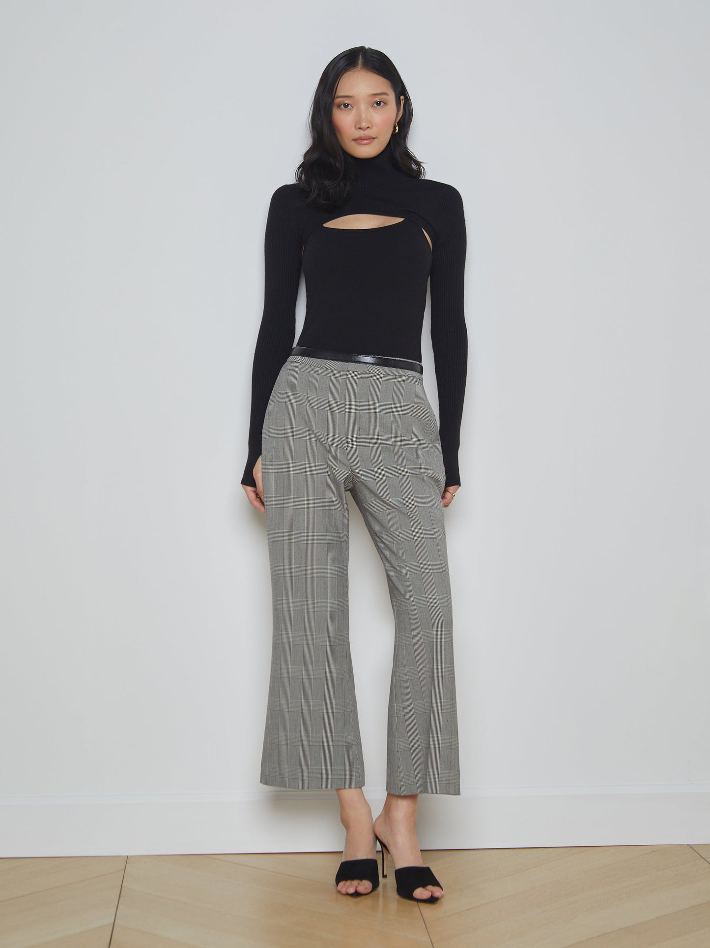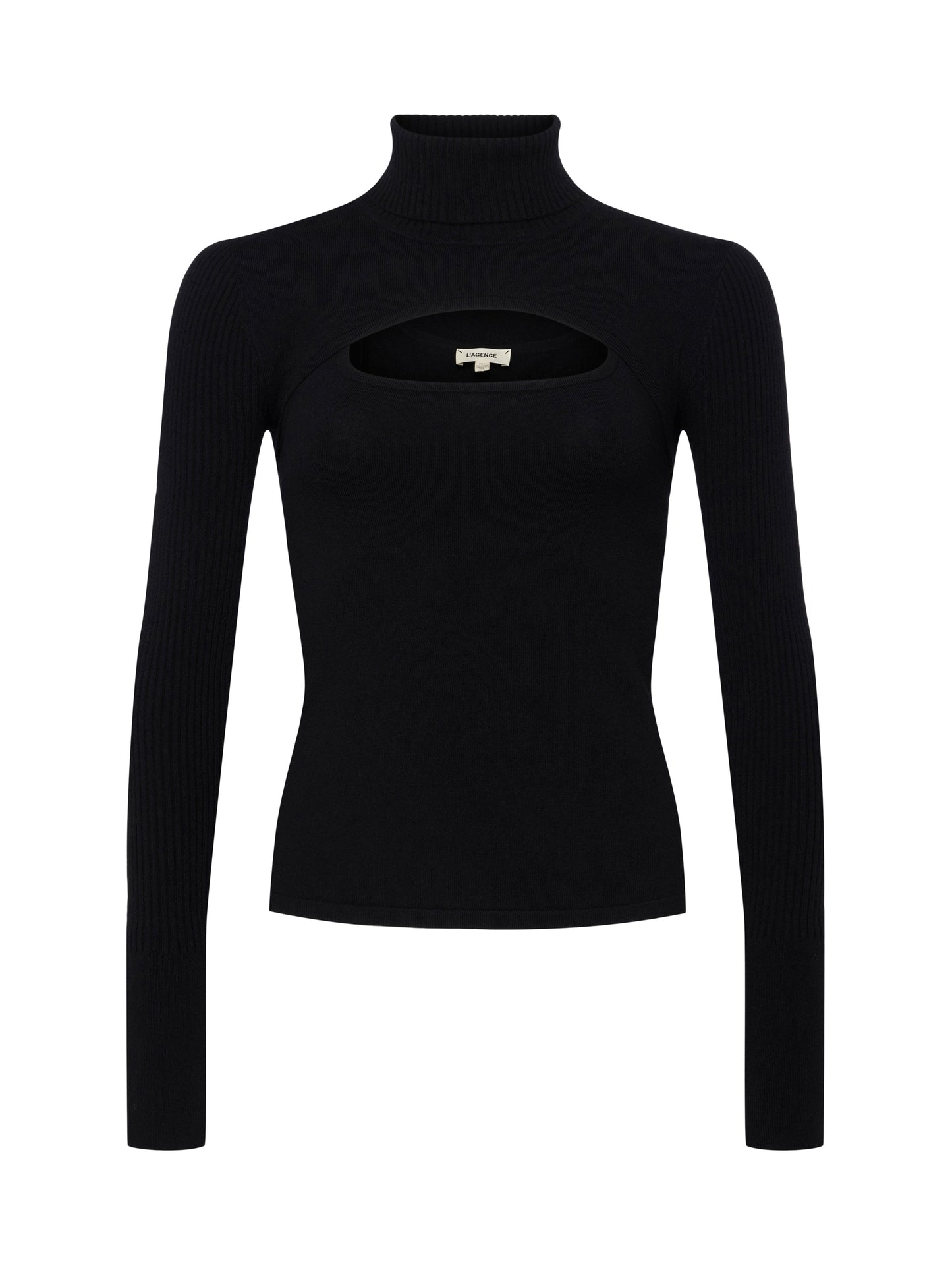 The Ember Top Black from L'AGENCE is a stylish two-piece knit top with a modern twist. The sleek combination of a scoopneck tank and a turtleneck topper with strategic ribbing creates a stunning, sexy cutout. The detachable long sleeve features a thumbhole for added flair. Make a statement and add this unique top to your wardrobe!