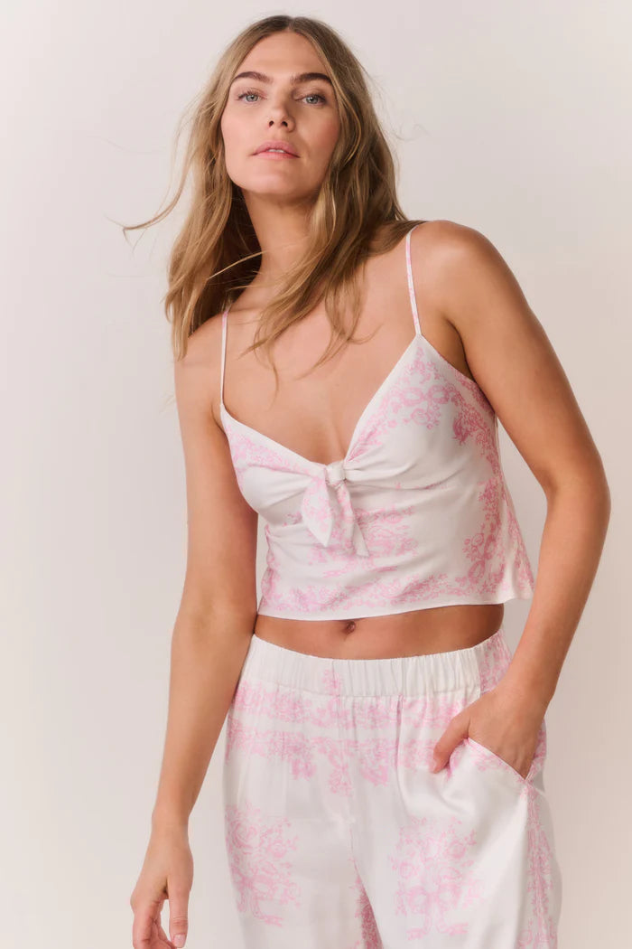 The Emeraine Camisole Top brings effortless elegance with its cropped, airy design and delicate spaghetti straps. The flattering V-neckline and low back create a softly feminine silhouette, while the bandana toile print in ivory heirloom tones adds timeless charm. Crafted from fluid fabric that moves with you, this romantic piece features a sweet center-front tie detail that captures a playful, fresh spirit. It's a versatile wardrobe essential that feels both romantic and modern.