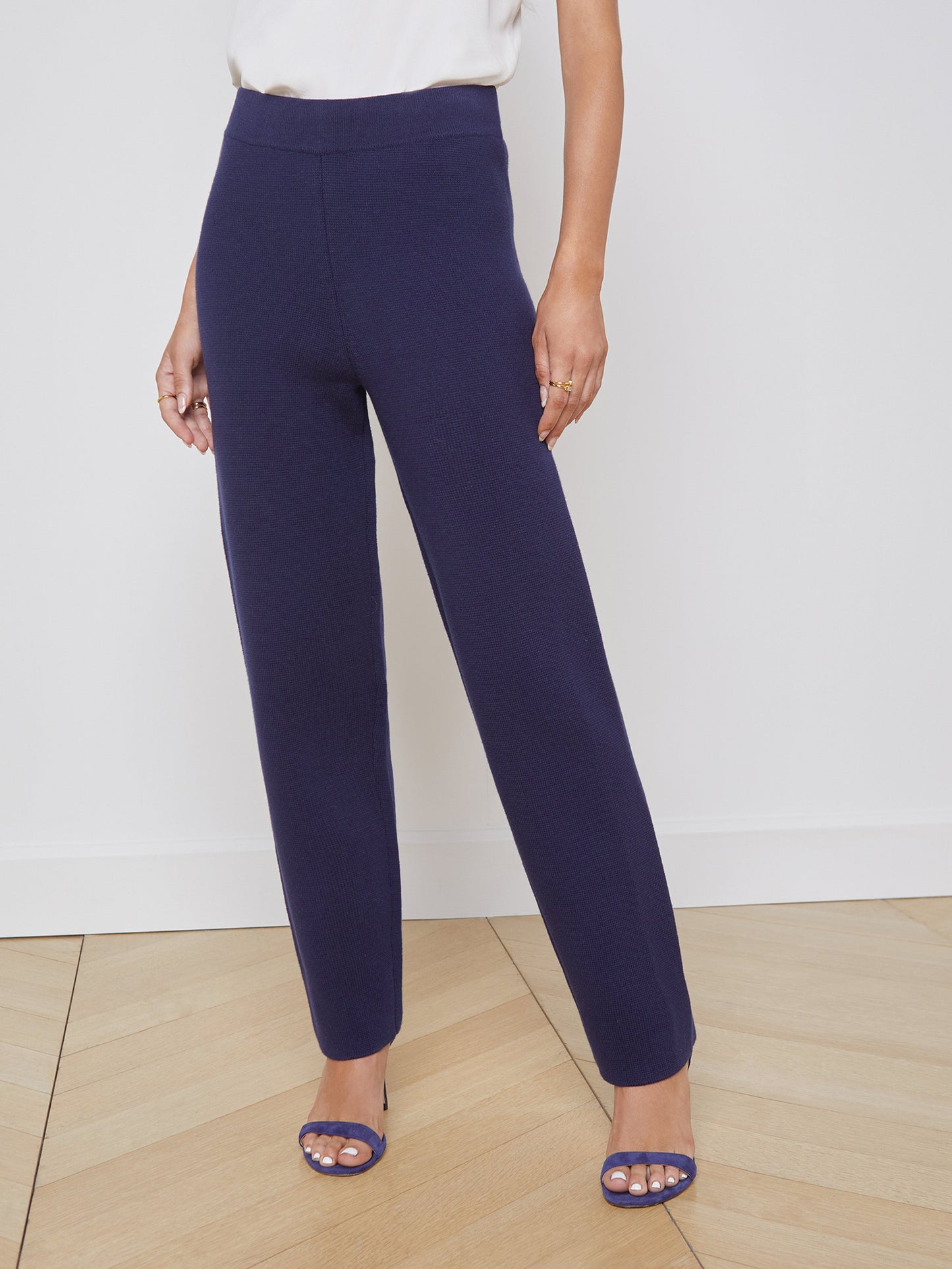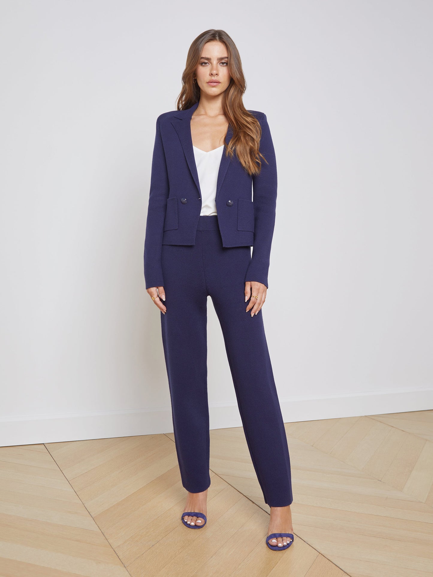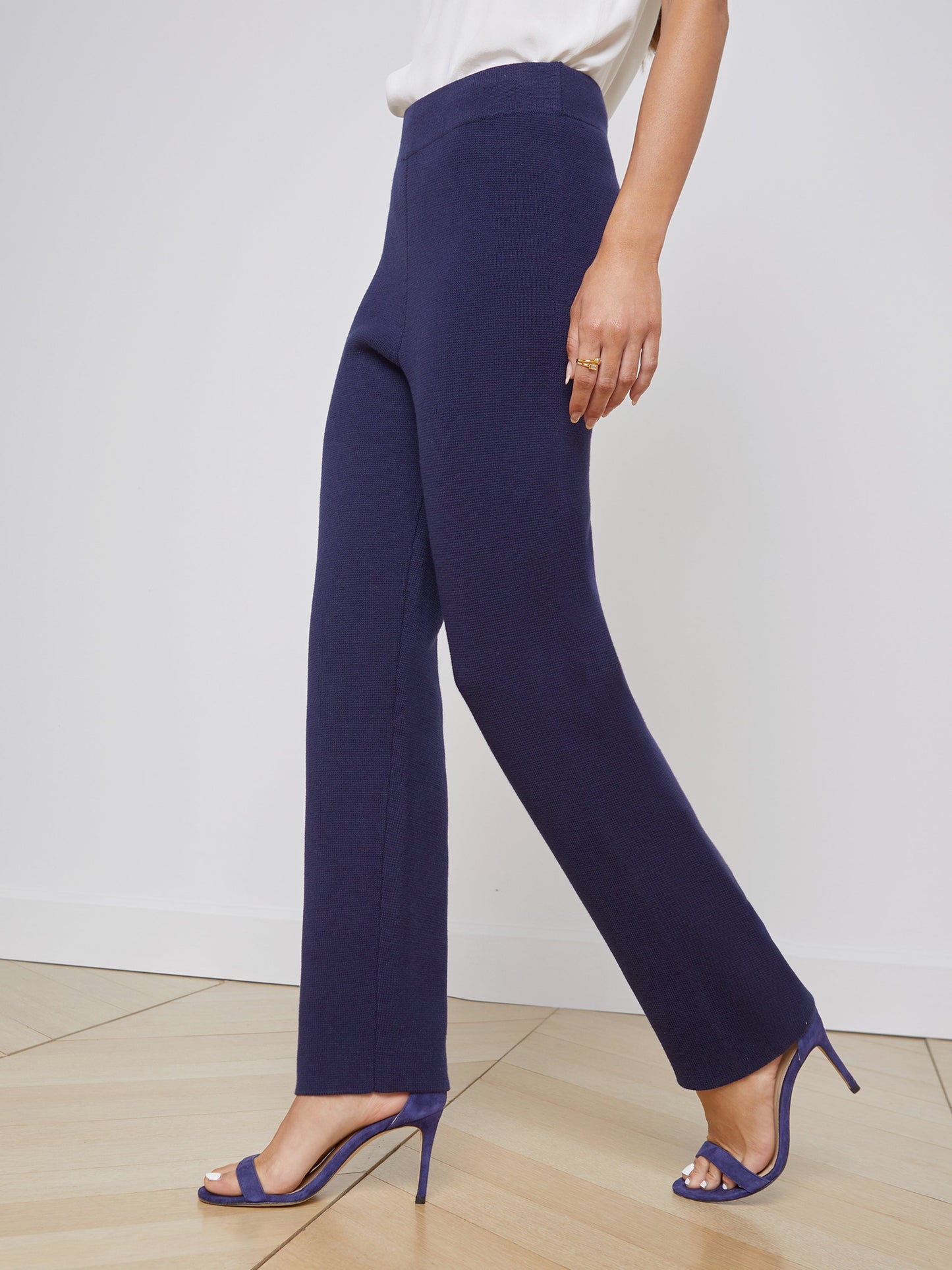 Welcome effortless sophistication to your wardrobe with the L'AGENCE Enda Knit Pant. Cut from a specially developed compact cotton-blend fabric that hugs the waist and hip before draping into a straight leg, these pants exude timeless elegance. Enjoy the comfort and structure of these pants day or night, while turning heads with their Midnight Blue hue.
