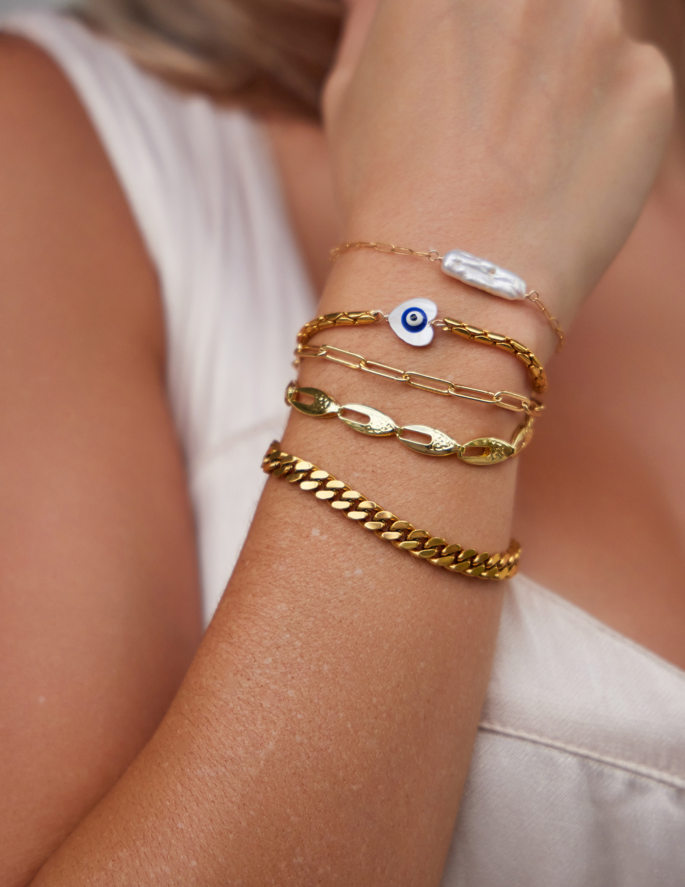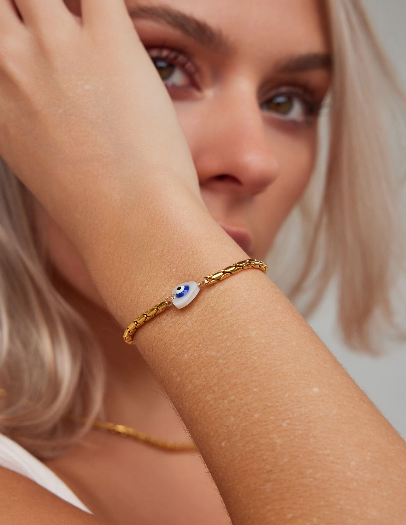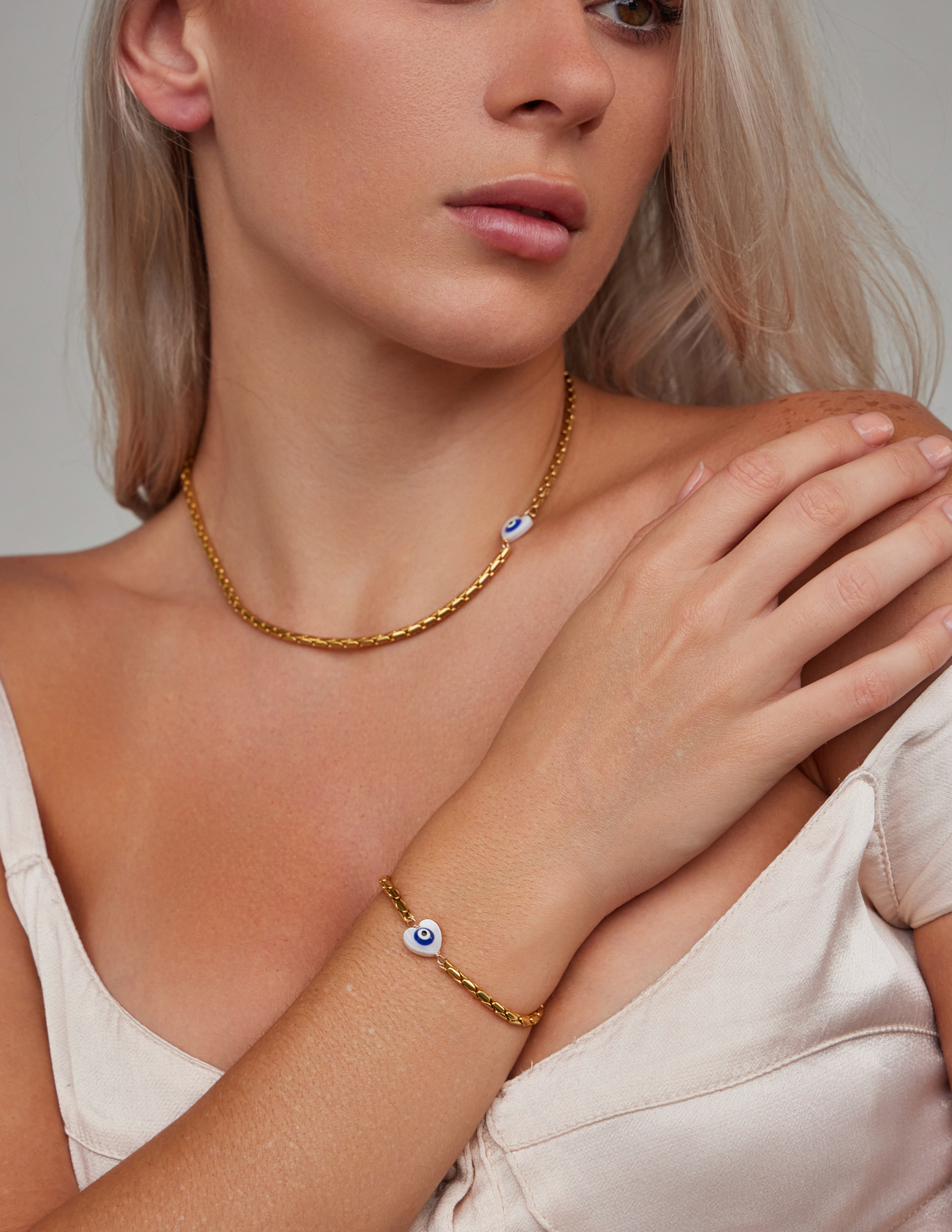 Introducing the Eye Love You Bracelet, designed by Adriana Pappas. Adorned with a stunning mother of pearl heart bead, this bracelet boasts 14k gold plated finishes for a luxurious touch. With an adjustable length of 6.25-8 inches, this handmade piece exudes good vibes and is proudly crafted in the USA. Please note that due to the natural materials used, each bracelet may vary in size and shape.