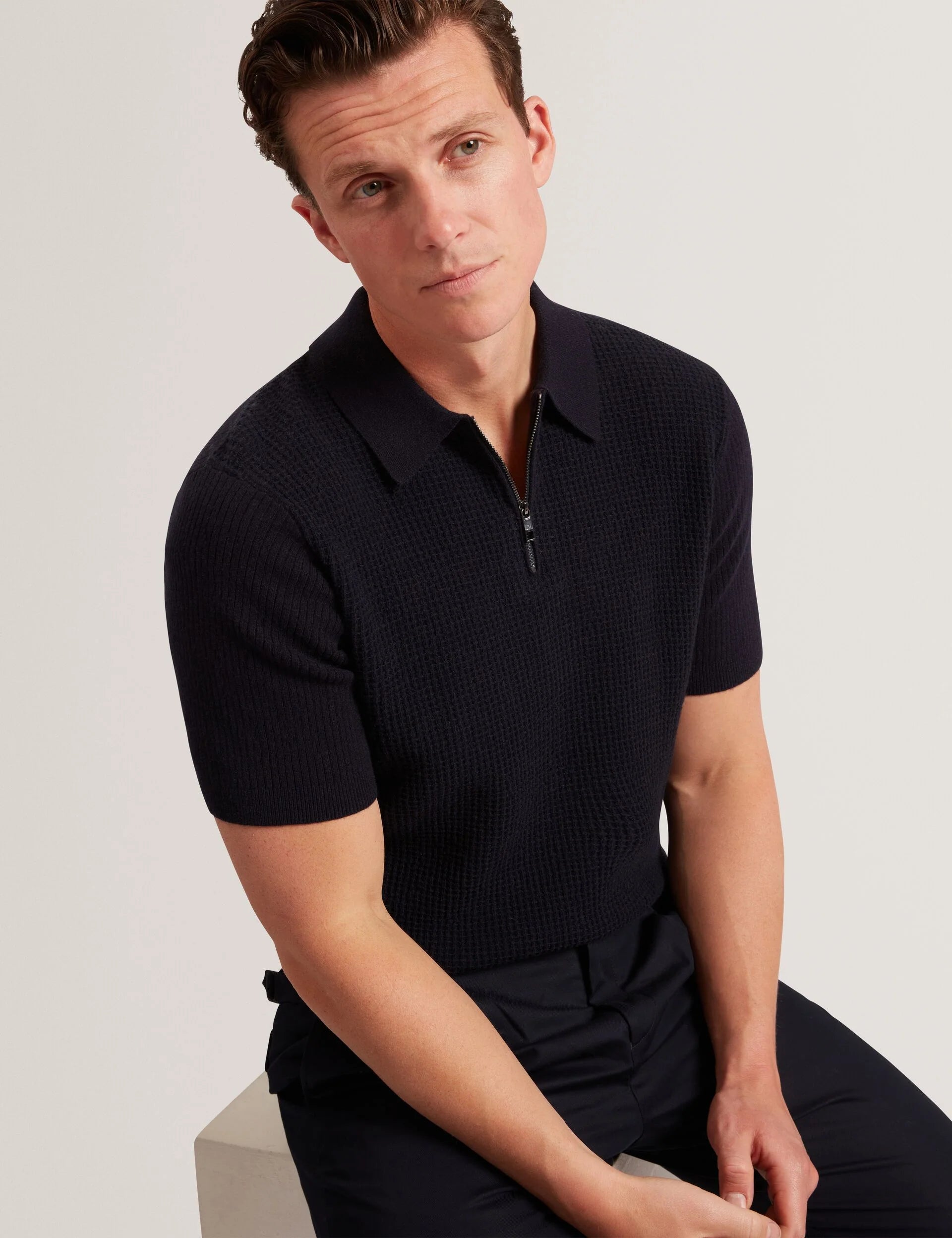 Jaylon Waffle Knit Zip Neck Short Sleeve Polo Navy - Ted Baker