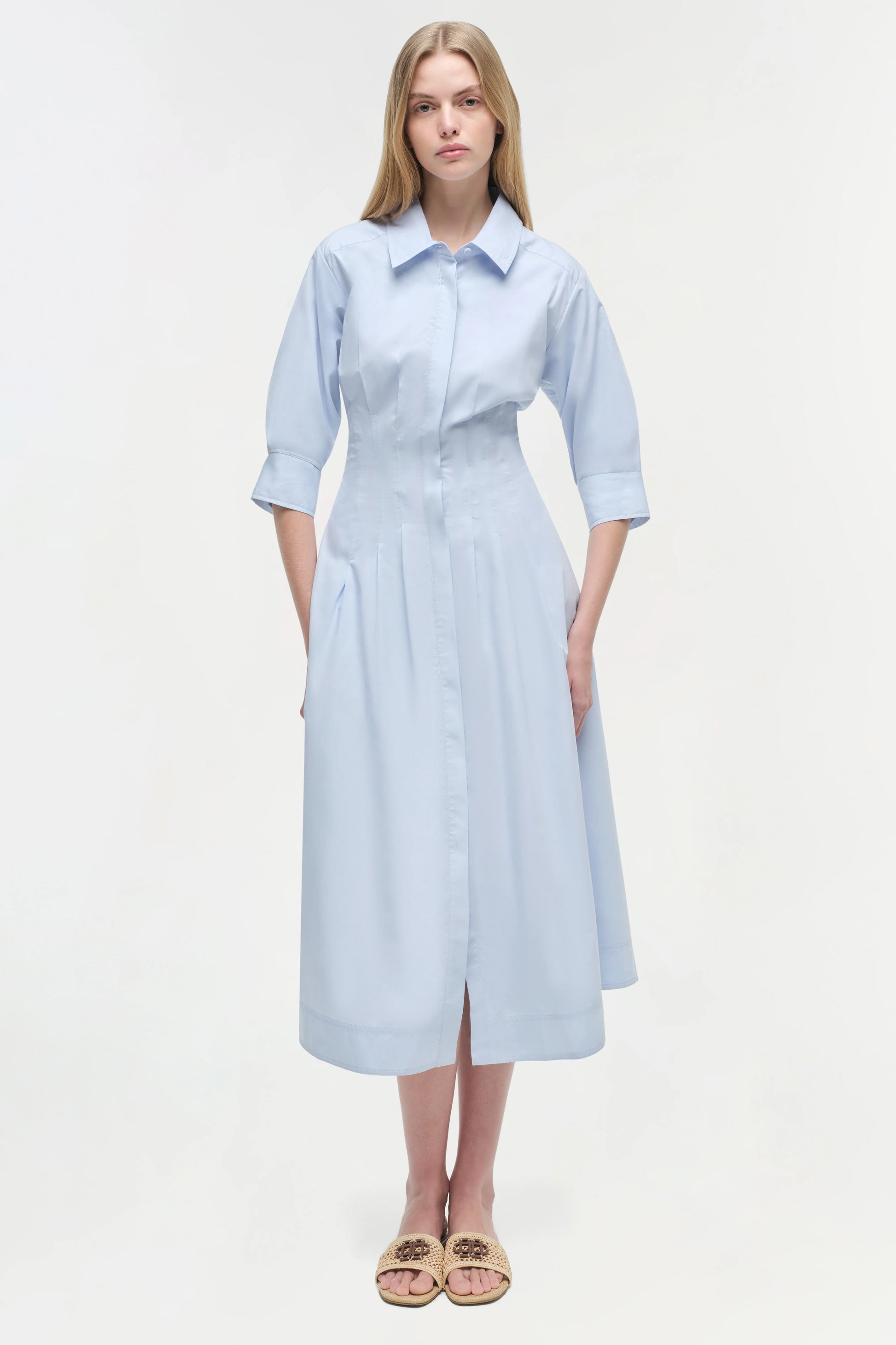 This Jazz Cotton Midi Dress in French Blue reimagines the classic shirtdress with a playful twist. Crafted from structured cotton poplin, it features crisp creased elbow sleeves, a pleated waist, and a full skirt that moves with purpose. Perfect for adding a fresh, fun vibe to your wardrobe while keeping a polished silhouette.