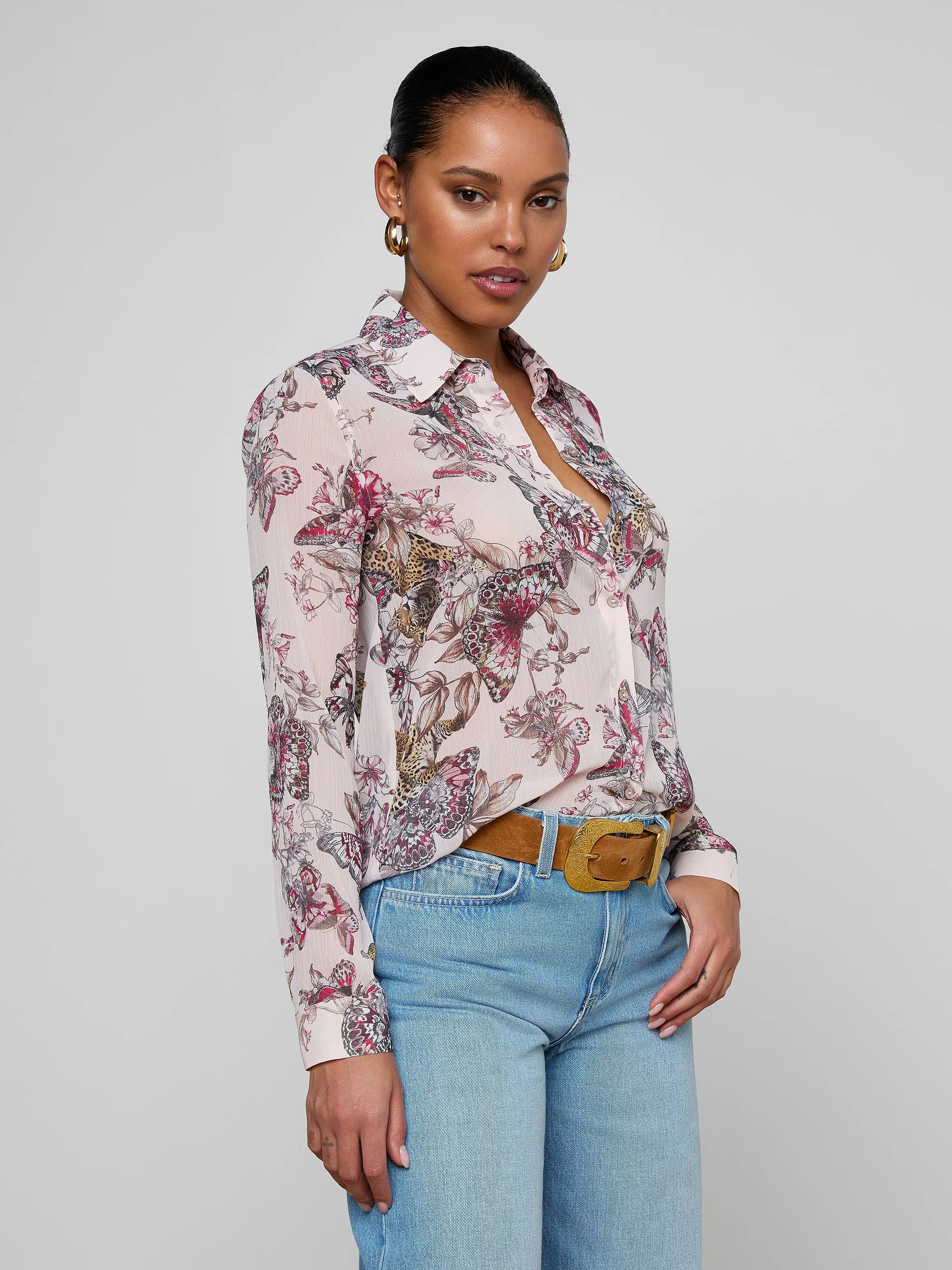 Introducing the Laurent Blouse—where wanderlust meets wardrobe staple. This relaxed-fit long sleeve button-down features an enchanting butterfly jungle print that's equal parts romantic and untamed. Crafted from sheer, lightweight poly chiffon with a subtle crinkle texture, it's a packing dream and layering essential. Throw it over your favorite day dress, pair it with denim, or wear it solo for effortless style that travels as well as you do.