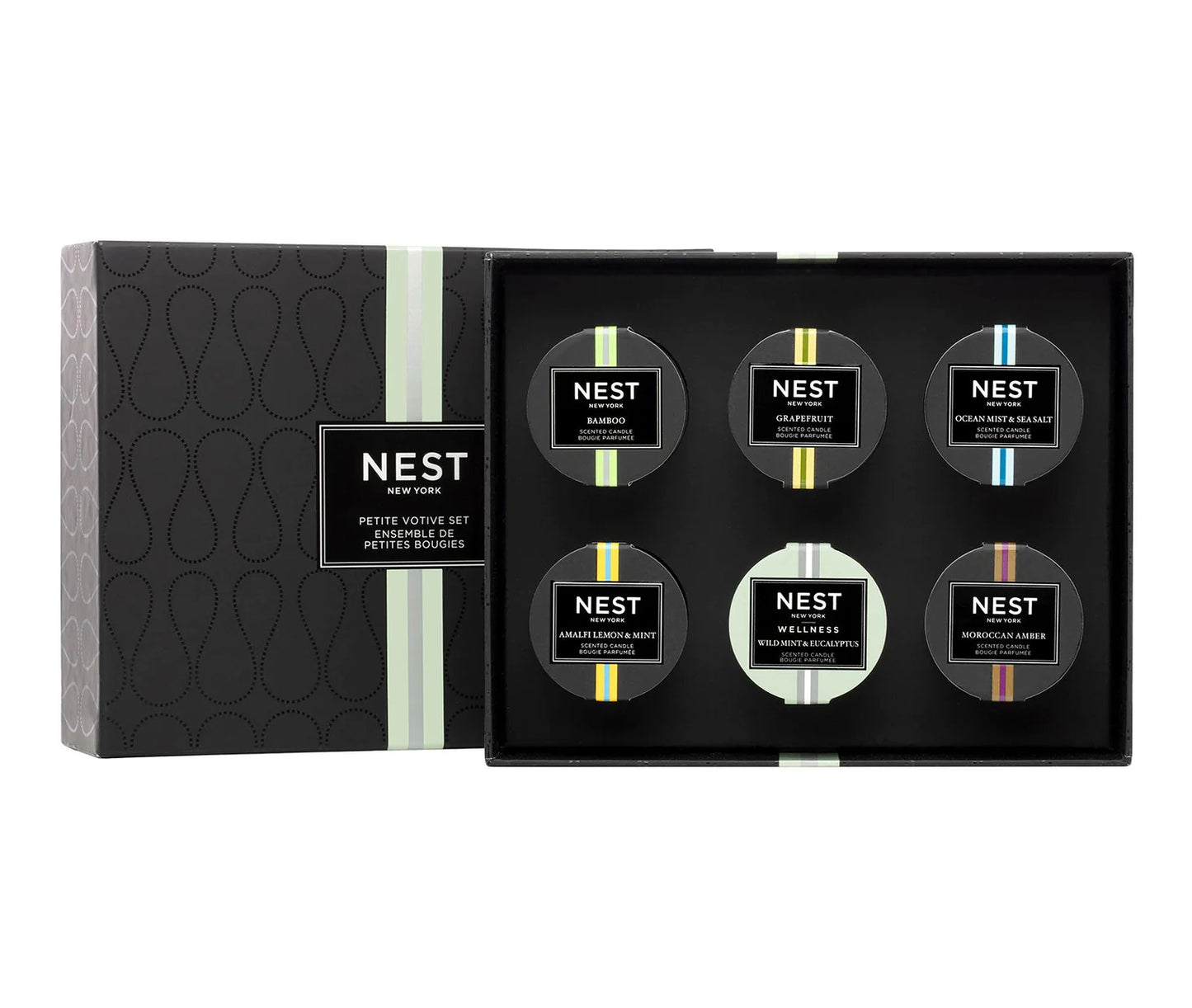 Elevate any space with our Luxury Mini Votive Set! With 6 heavenly scents of Bamboo, Grapefruit, Moroccan Amber, Ocean Mist & Sea Salt, Amalfi Lemon & Mint, and Wild Mint & Eucalyptus, this beautifully packaged set will guarantee the perfect ambiance! Ignite a passion for luxury with NEST today!