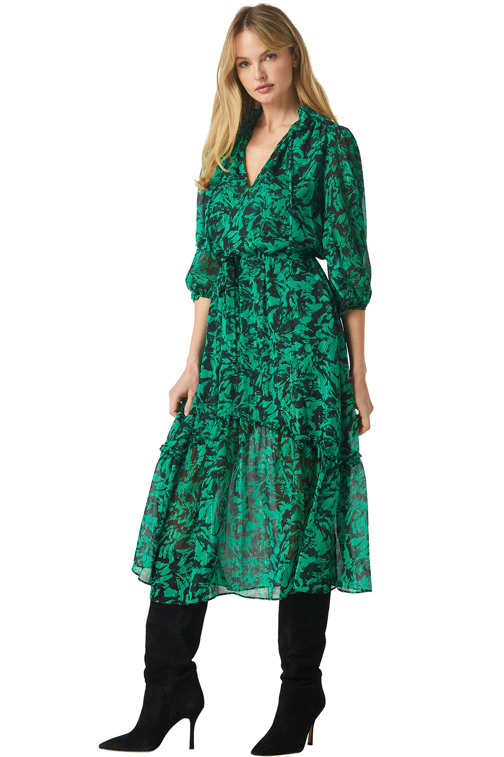 Turn heads in the Olivia Dress Emerald Abstract by MISA. This effortlessly feminine midi silhouette features a rich emerald and black abstract print with shimmering lurex pinstripes. The adjustable tie-waist, semi-sheer blouson sleeves, and signature string petal ties at the open neckline add a touch of chic to this playful dress.