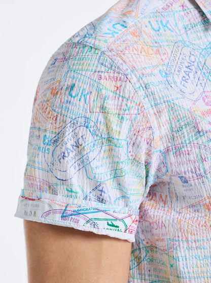 Embark on a global adventure in style with this Passport Short Sleeve Button Down Shirt by Robert Graham. Featuring a vibrant print of colorful passport stamps, this shirt is a playful reminder of your travels. Made with seersucker fabric, it's perfect for sparking your wanderlust and discovering hidden details.
