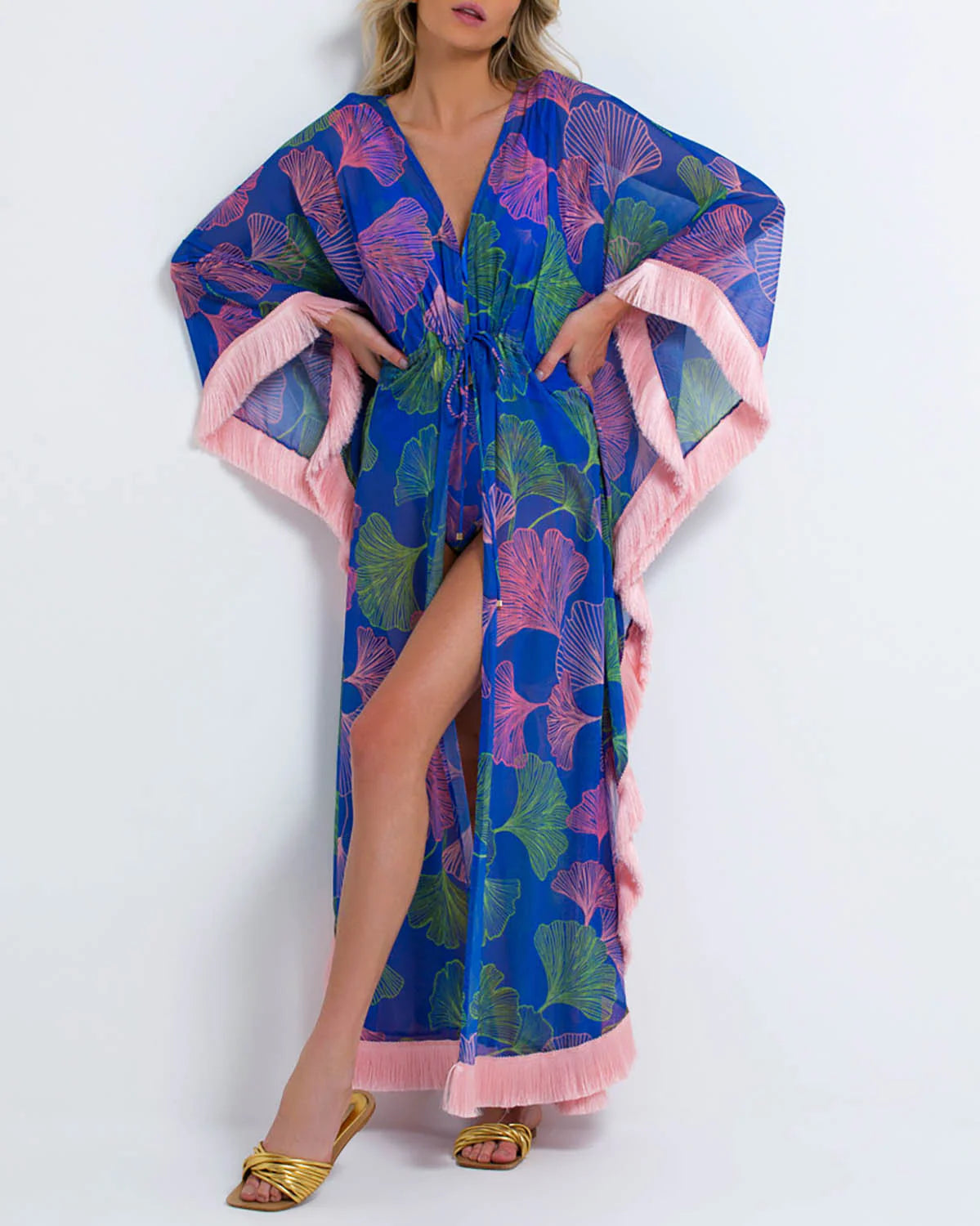 Dive into the deep blue sea of fashion with this Ocean Leaf Fringe Trim Caftan Blue from PatBO! The airy chiffon fabric and hand-sewn pale pink fringe trim will make you feel like you're floating in a dreamy summer breeze. The drawstring tie waist creates a flowy, oversized fit - the perfect coverup for any beach day!