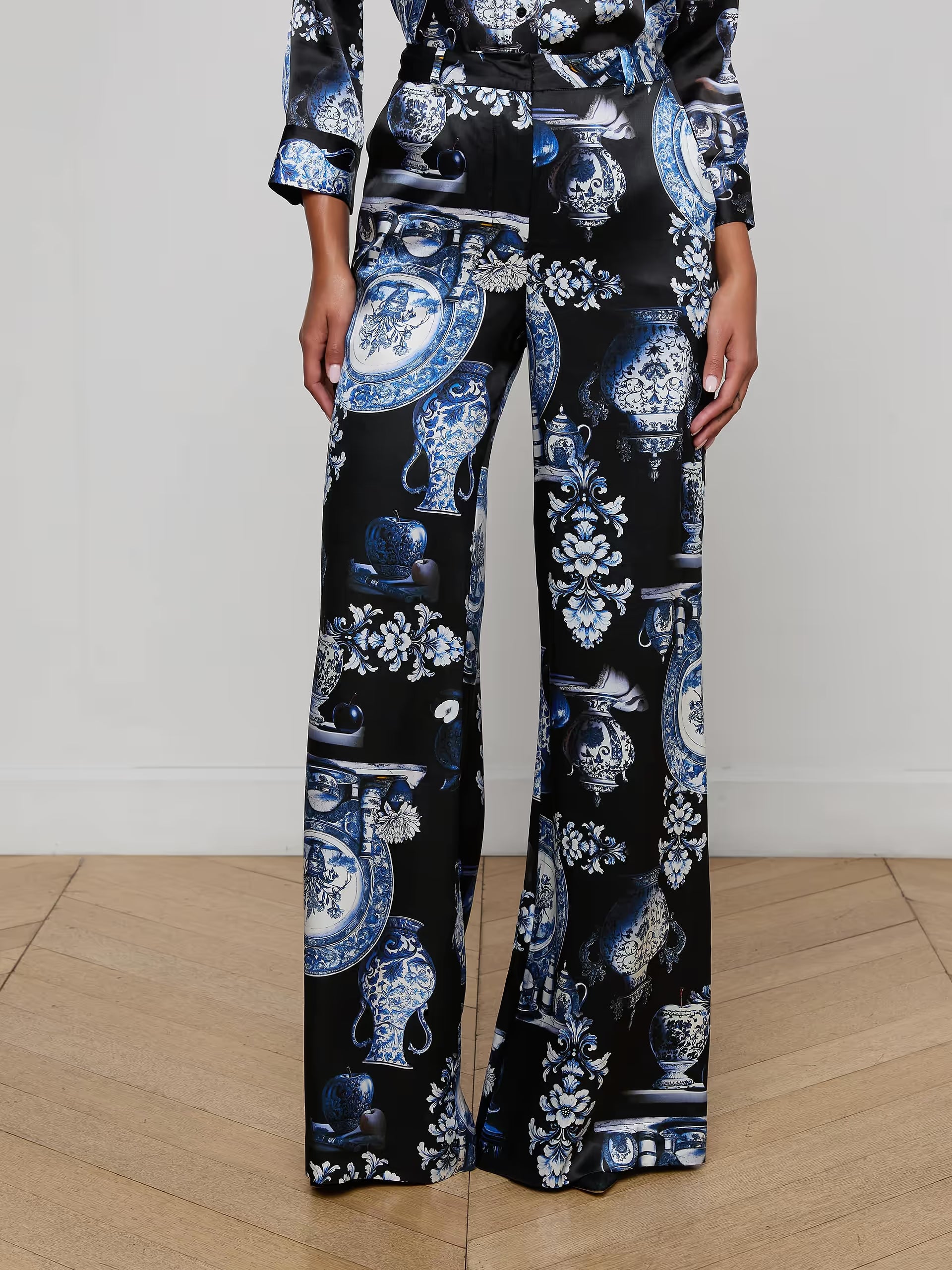 Pilar Silk Wide-Leg Pant Black/Blue Large Porcelain - L'AGENCE
