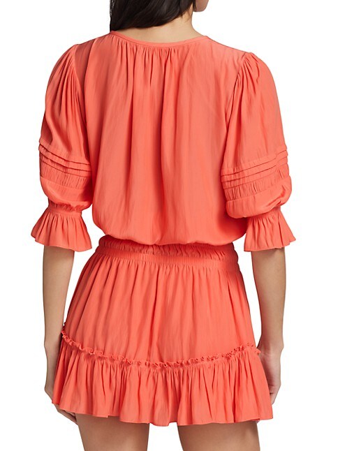 Look effortlessly chic in Ramy Brook's Aleks Peasant Mini Dress. With a billowy silhouette, smocked waistband and pleated details, you'll love the way this beautiful guava-hued dress fits and flatters. Feel elegant and alluring in this key-hole tie dress, perfect for any occasion.