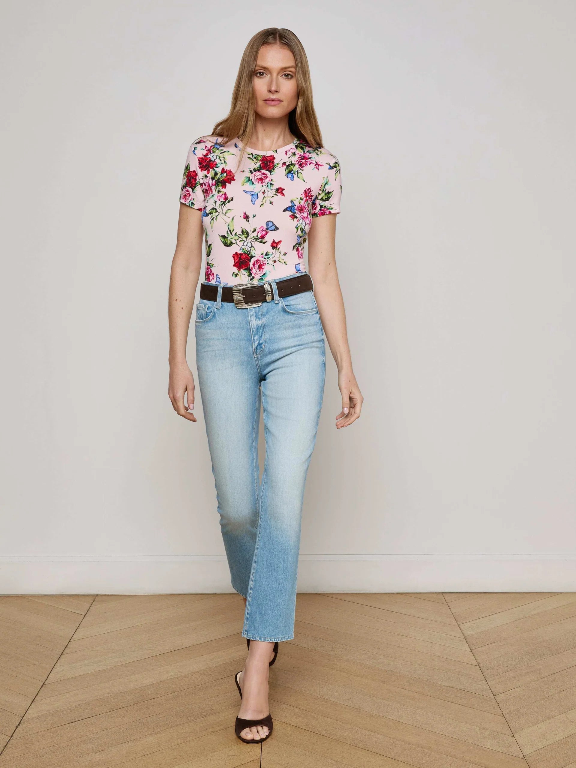 Embrace effortless charm with the Ressi Fitted Tee in Light Pink Multi Femme Rose. Crafted from a soft, supple fabric and tailored in a slim cut, this tee flatters your silhouette while adding a playful touch with its delicate butterfly and rose print. Perfect for brightening your day with a feminine flair, it’s a beloved L'AGENCE classic that’s back and ready to delight.