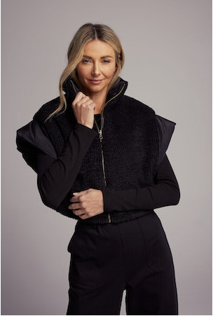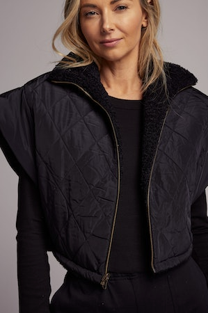 Stay warm and stylish with the Rhea Vest Black - Sundays! This reversible vest has cozy sherpa on one side and stylish quilted fabric on the other. Easily change up your look with a simple zip up. Keep warm and look cool this winter!