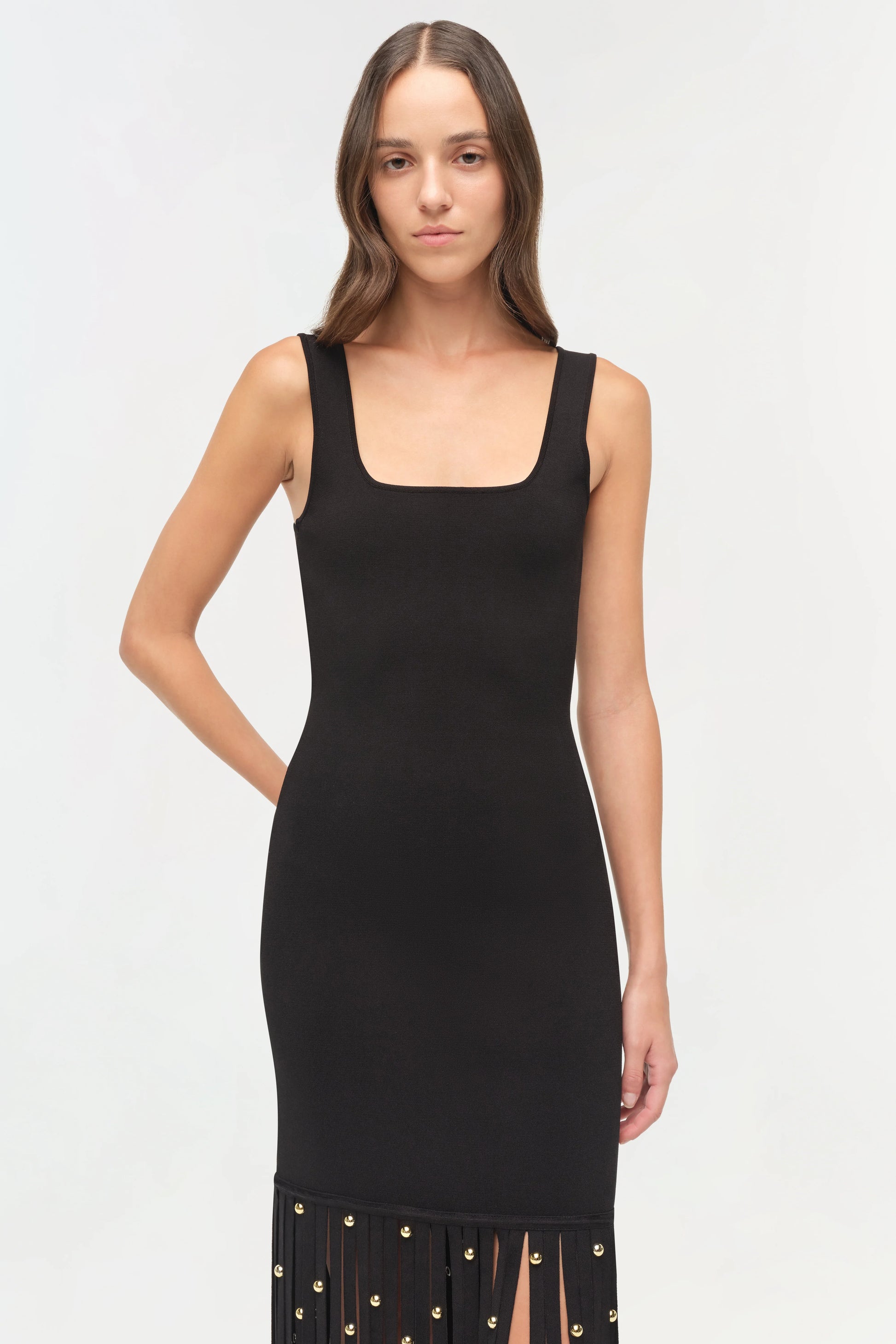 Knit in a matte compact weave, this midi dress contours the frame with smooth precision. A square neckline leads into a clean, elongating silhouette finished with cascading fringe detailed in metal hardware. Sleek and sculptural, it moves with ease.