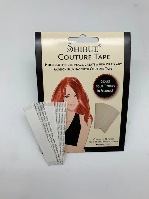Shibue Couture Tape is the best solution for keeping your breasts in place, hiding bra straps, securing revealing necklines, holding up strapless tops, eliminating blouse gaps, securing hem-lines and more. Our double sided stick strips are hypo-allergenic and help with all your fashion faux pas.