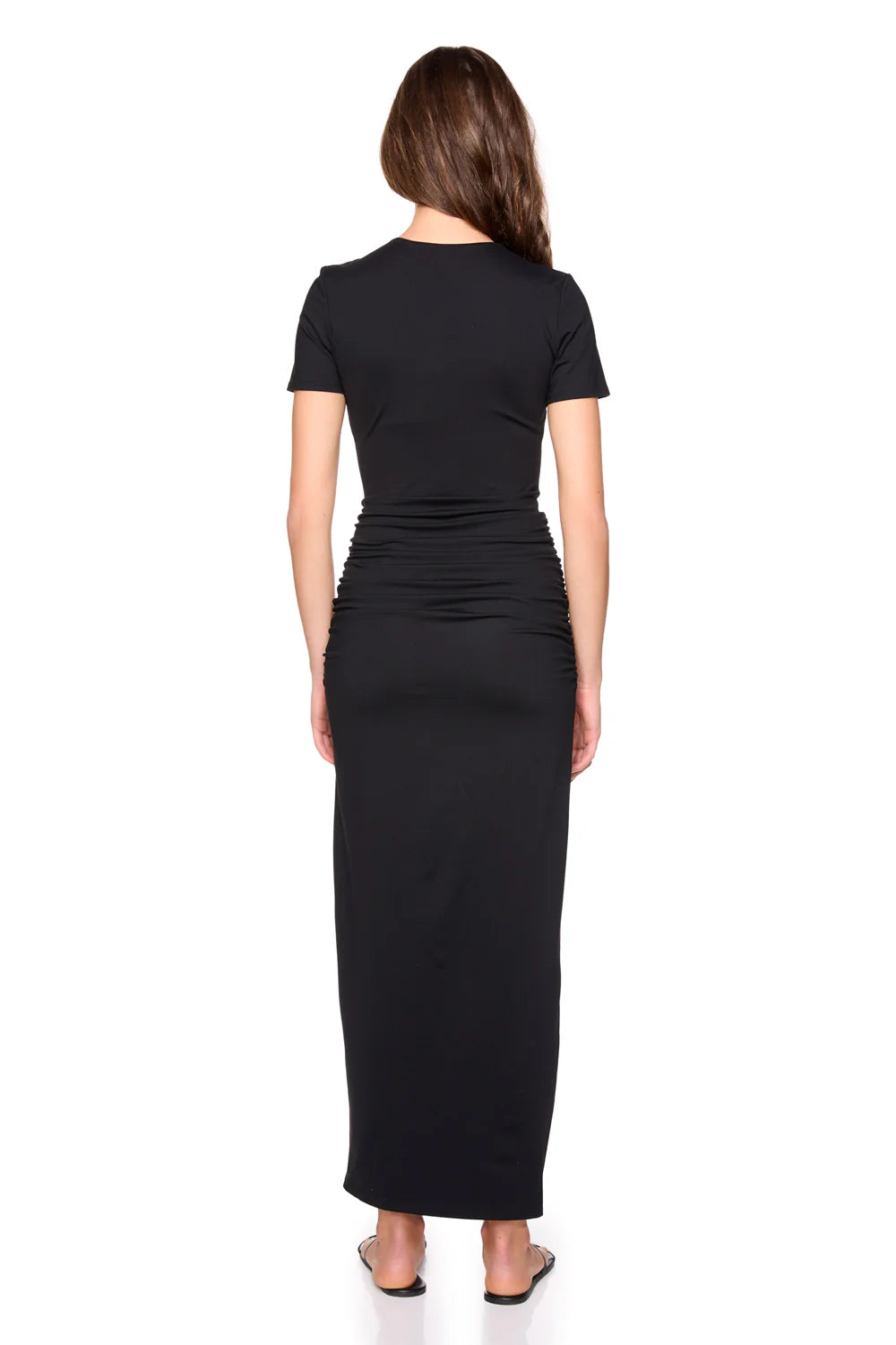 This sleek black dress features playful side ruching and a high slit that adds a flirty touch. With short sleeves and a classic crew neckline, it hugs your curves in all the right places. The ankle-length cut keeps it elegant while the form-fitting design ensures you stand out wherever you go. Perfect for turning heads with effortless style!