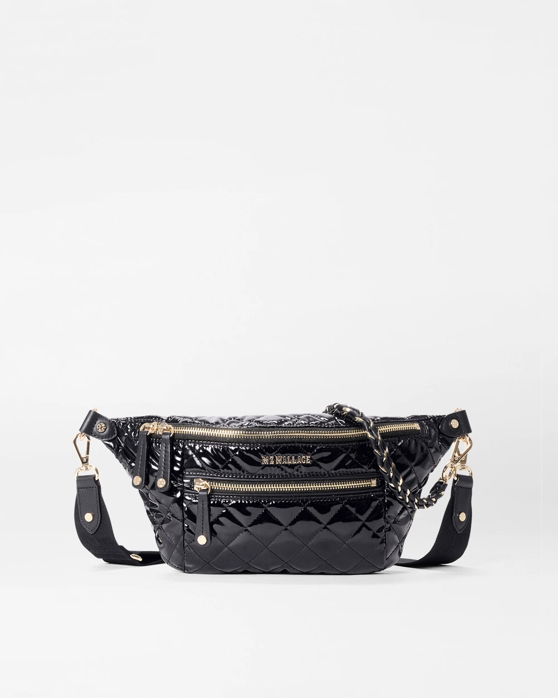 The Small Crosby Sling Black Lacquer - MZ Wallace offers convenience and style with its versatile closure options - zip top, detachable crossbody, adjustable waist, and detachable chain strap. Its signature red leather edging adds a touch of luxury while the exterior pocket provides easy access to essentials.