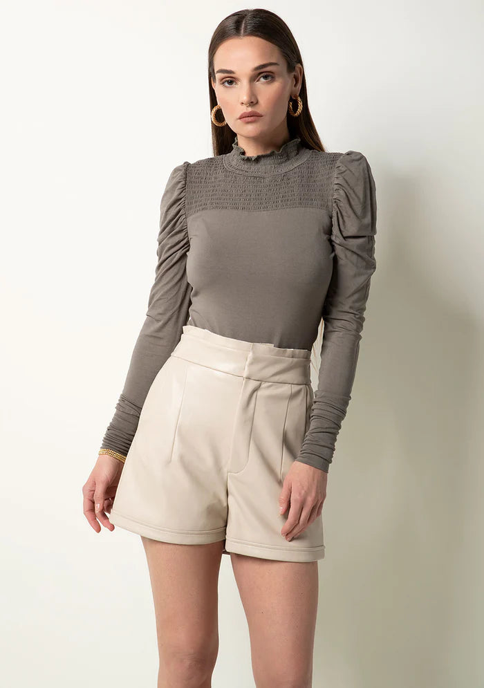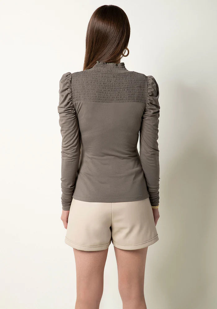 Our unique Letisha Top is romantic and chic, featuring a shirred collar and yoke, long mutton sleeves and light shirring on the wrists.