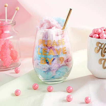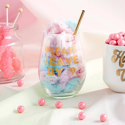 Celebrate in style with this cute and fun stemless wine glass! • Please Leave by 9 • Traditional size